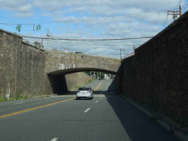Hamilton Avenue passes under the Harlem Line of the Metro-North Railroad and then curves to the northwest, merging with Main Street, which carries the eastbound side of NY 119 through White Plains.