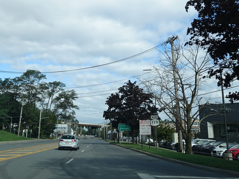 NY 119 is now a six-lane divided road called Tarrytown Road. Turn right at the first traffic light for an entrance to the Bronx Parkway. Turn left to go south on Central Park Avenue (NY 100). Northbound NY 100 is multiplexed with NY 119 along Tarrytown Road straight ahead.