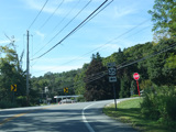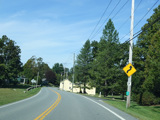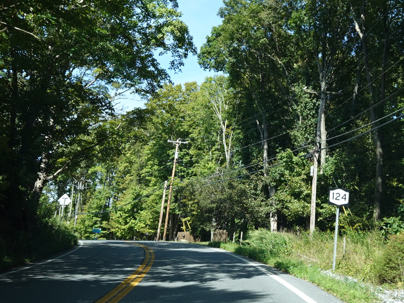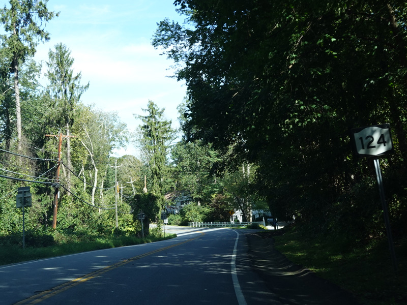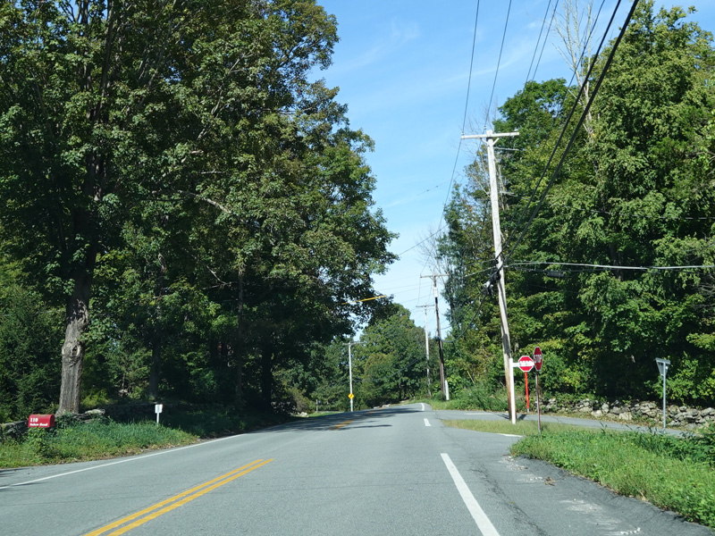 Salem Road ends at a stop sign at Spring Street. Contrary to what one might infer from the signage, this is not Old Post Road (NY 35). Turn left to stay on NY 124. The section of Spring Street to the right is a reference route that provides to a shortcut to go east on Old Post Road (NY 35).