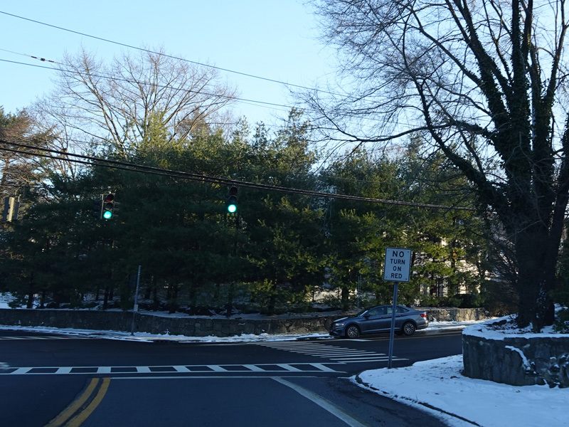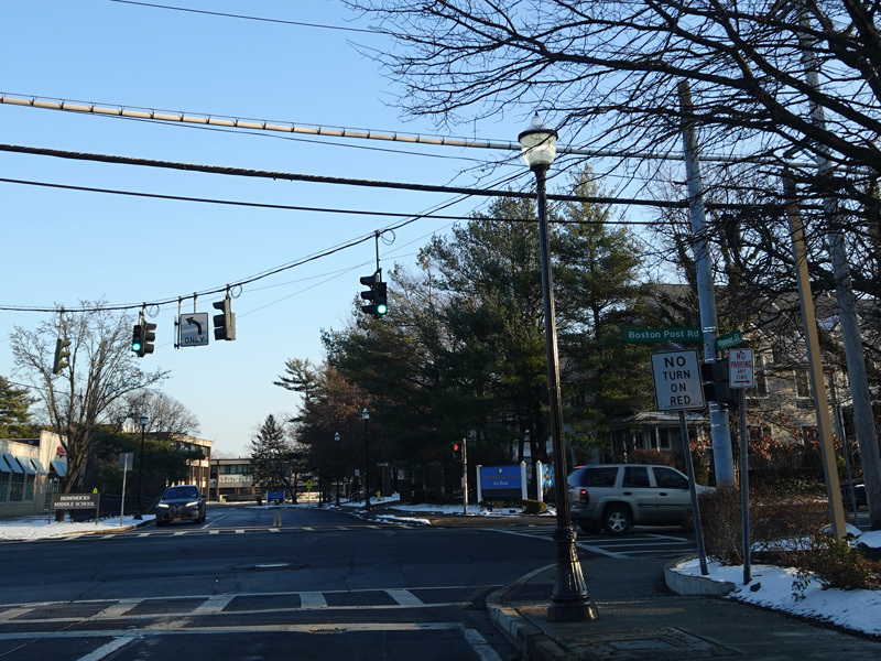 Weaver Street ends at a traffic light at Boston Post Road (US 1). Turn left to go north or right to go south.