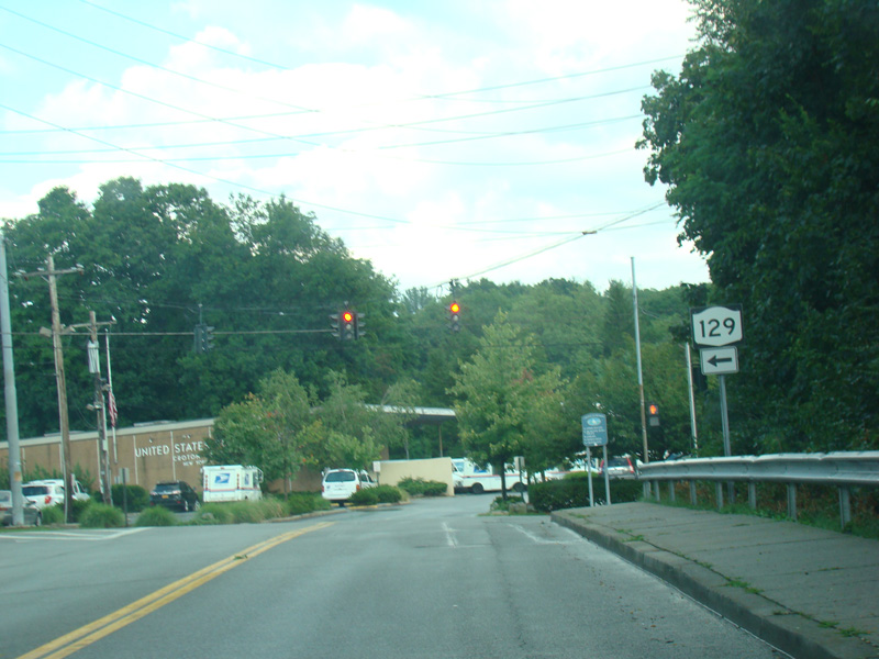 NY 129 begins at South Riverside Avenue (NY 9A) near where it splits off from the Croton Expressway (US 9) in Croton-on-Hudson and runs north along Municipal Place. After one block, Municipal Place ends. Turn left onto Maple Street to stay on NY 129.