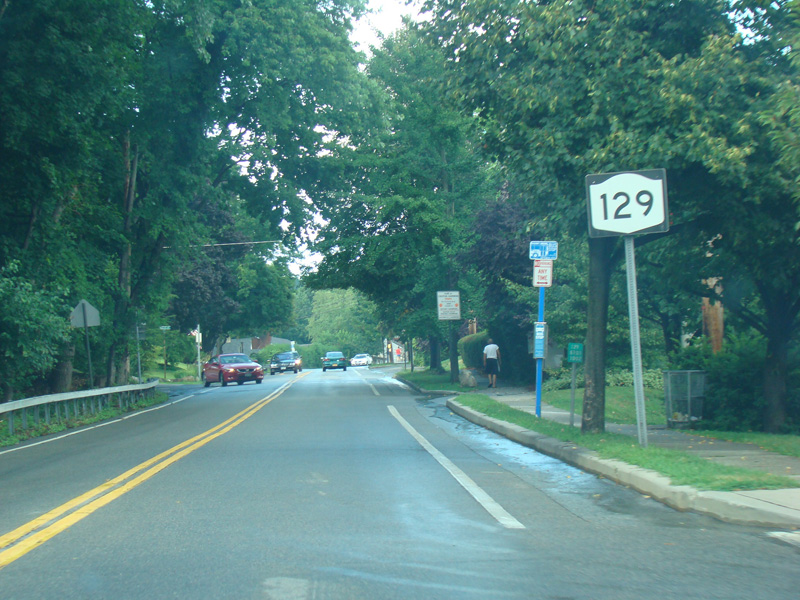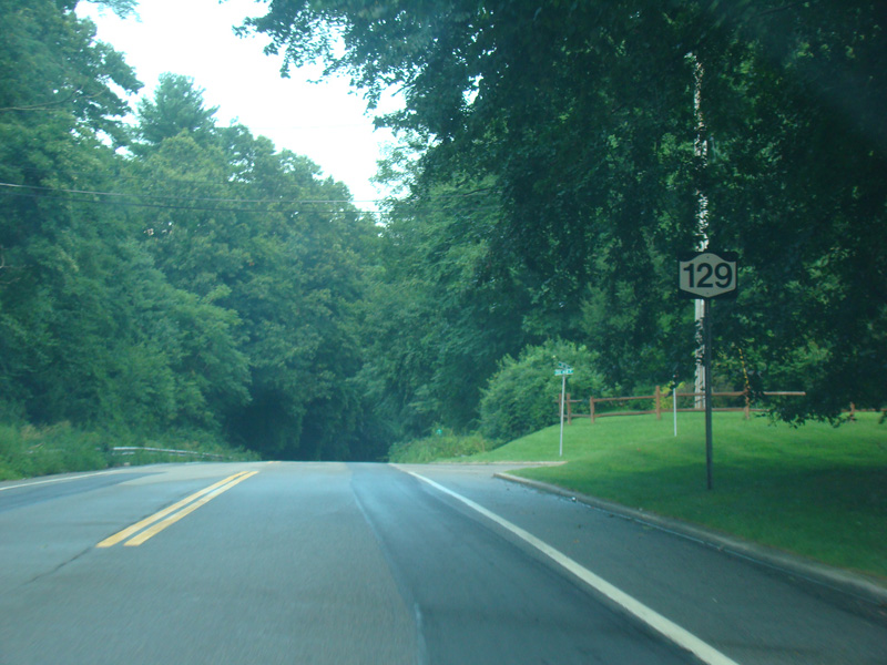 Welcome to Yorktown Heights! Here, NY 129 is called Croton Lake Road and runs along the north side of the New Croton Reservoir.