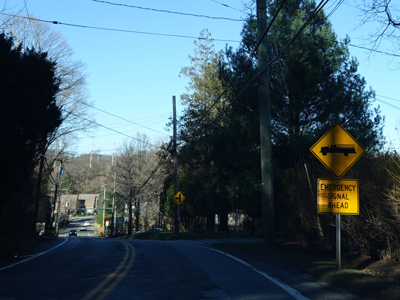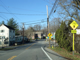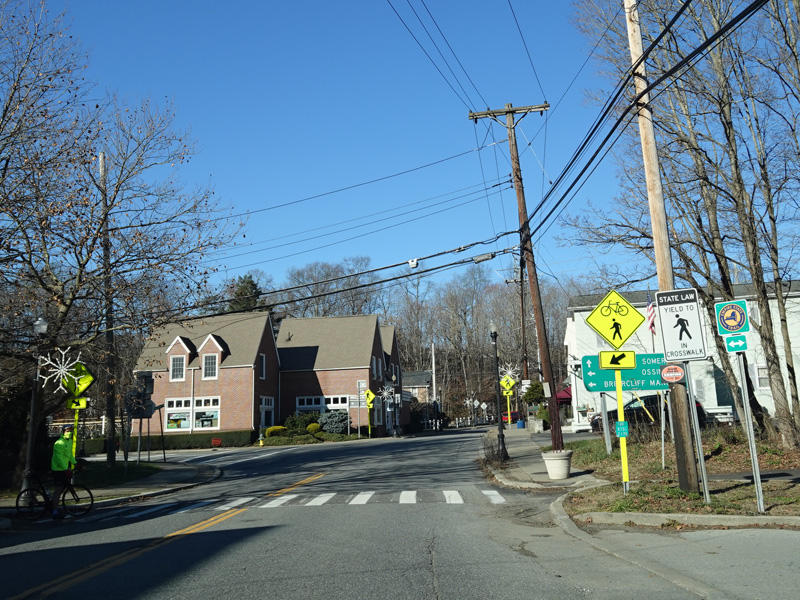 There is a pedestrian/bicycle crossing at the Empire State Trail, which is marked with route shields as if it were a road. Immediately thereafter, turn left onto Station Place to stay on NY 133. Continue straight ahead on Millwood Road for NY 120.