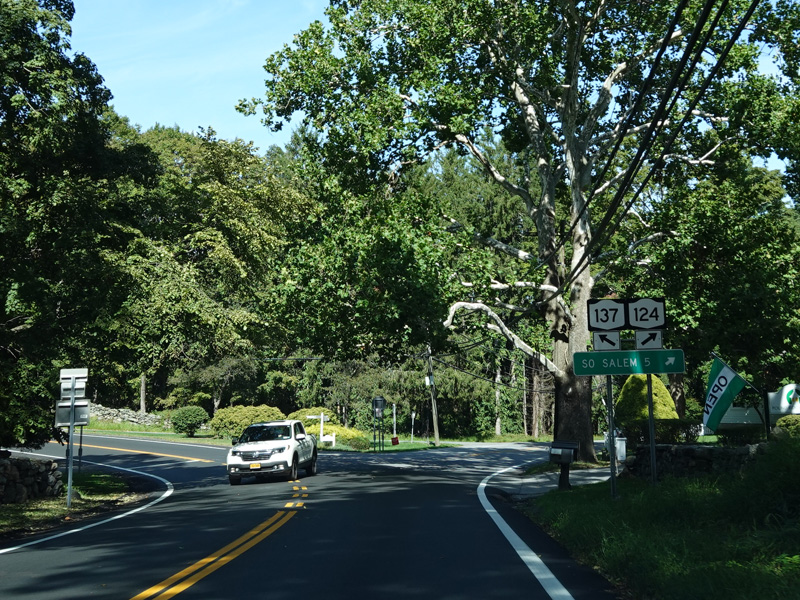 After a short distance, Westchester Avenue ends and the roadway splits. Bear left onto Stone Hill Road to stay on NY 137. Bear right for Salem Road (NY 124), which begins here.