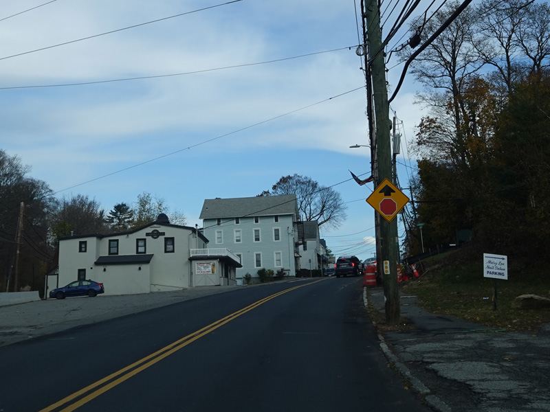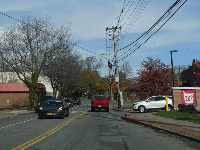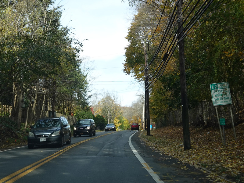 Broadway begins at Bradhurst Avenue (NY 100) just south of Saw Mill River Road (NY 9A) in Hawthorne. It runs east as a two-lane undivided road.