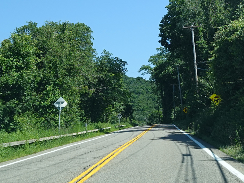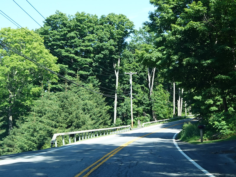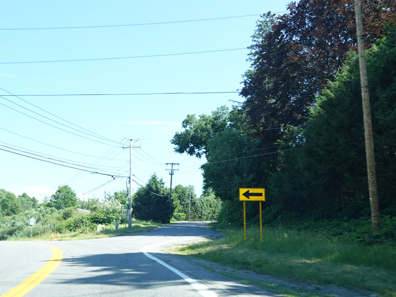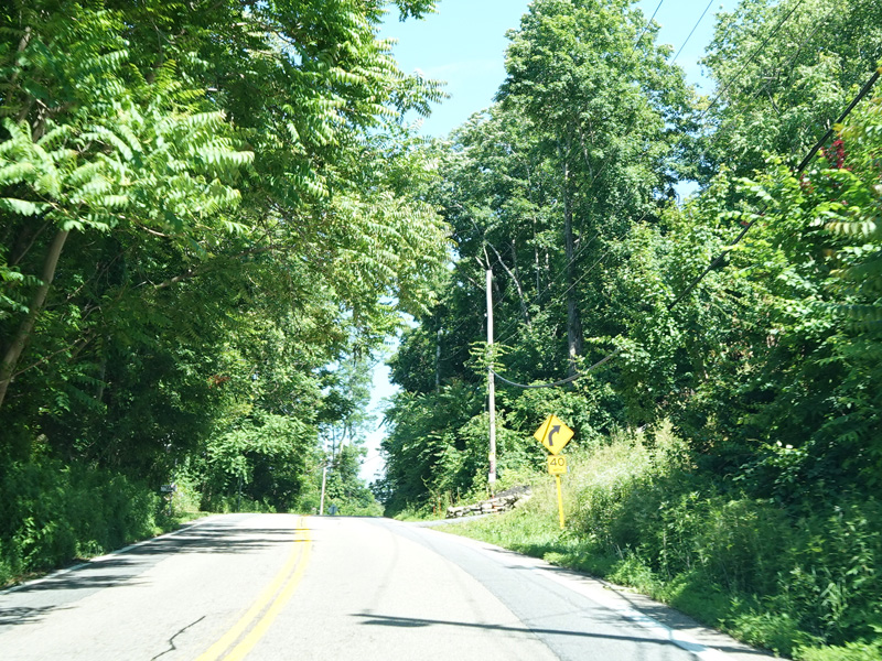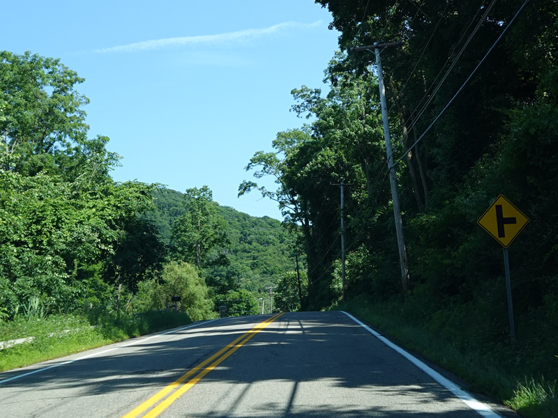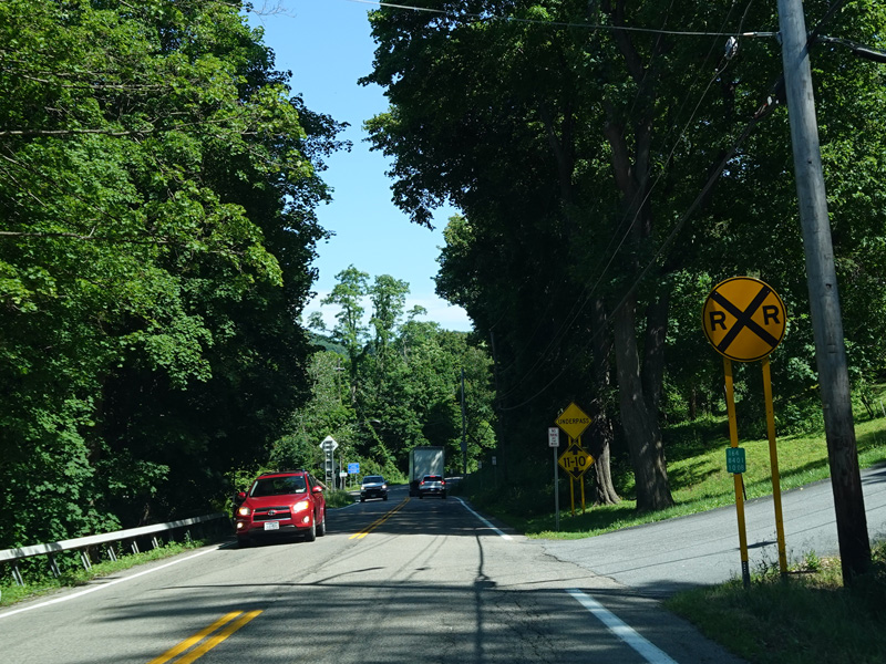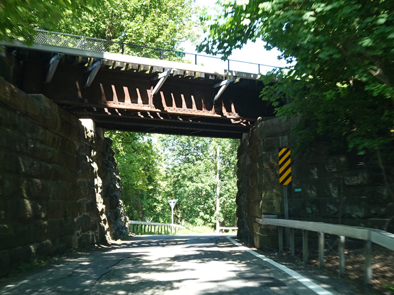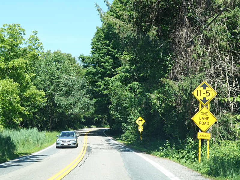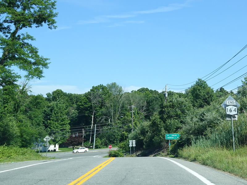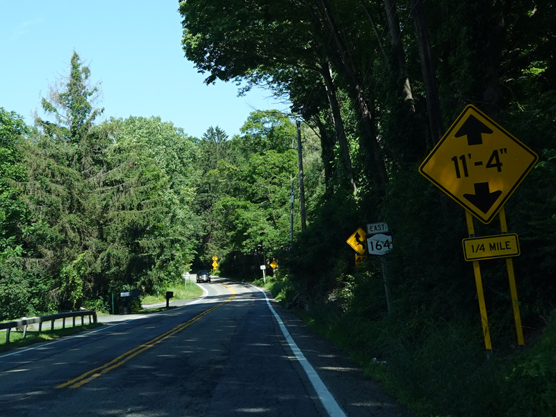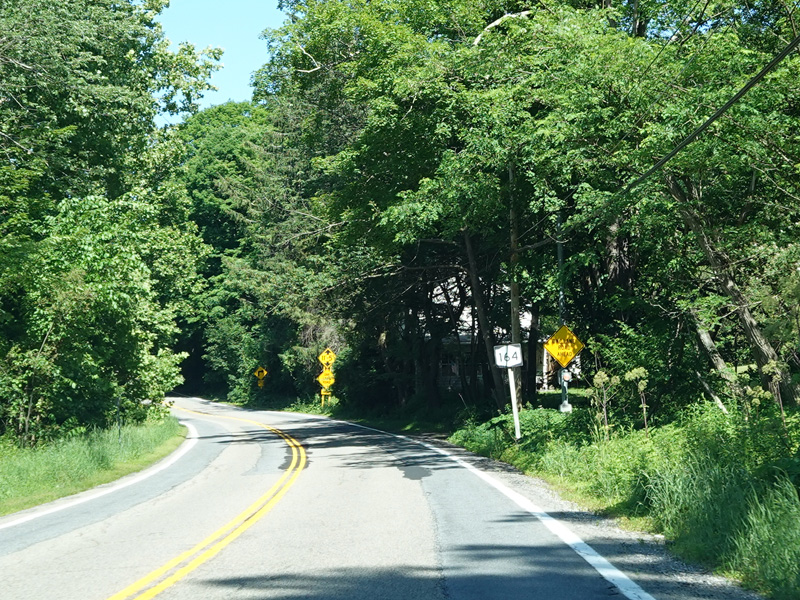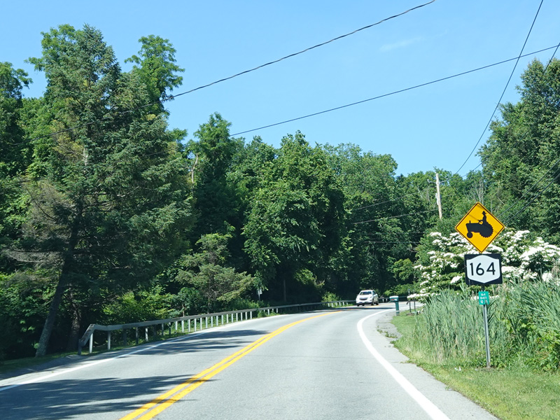 NY 164 begins at NY 311 in Carmel and runs east as a two-lane undivided road. It passes under the Beacon Line of the Metro-North Railroad twice. The signs warn of one-lane bridges, but it is not the bridges themselves that have one lane but rather the road passing under them that narrows to a single lane each time it crosses the tracks.