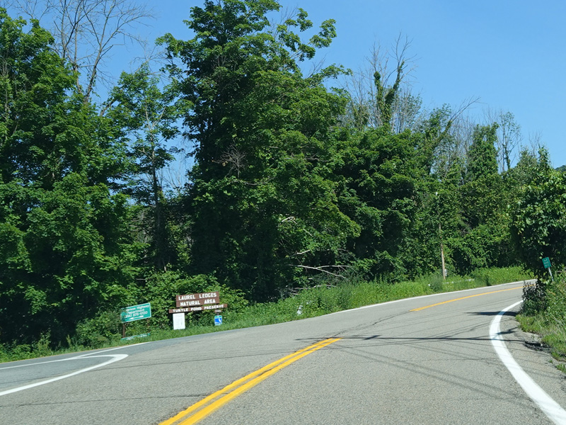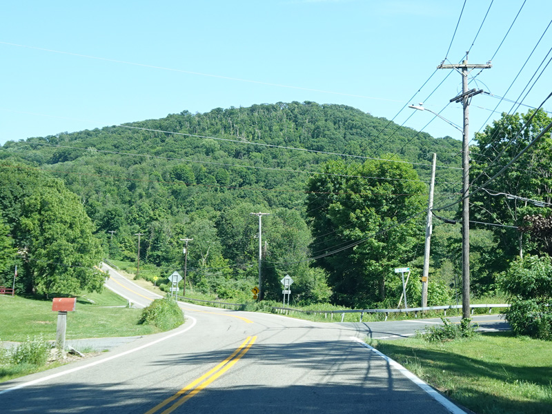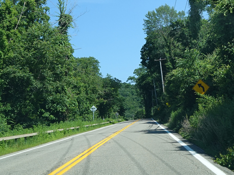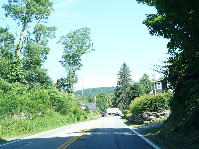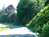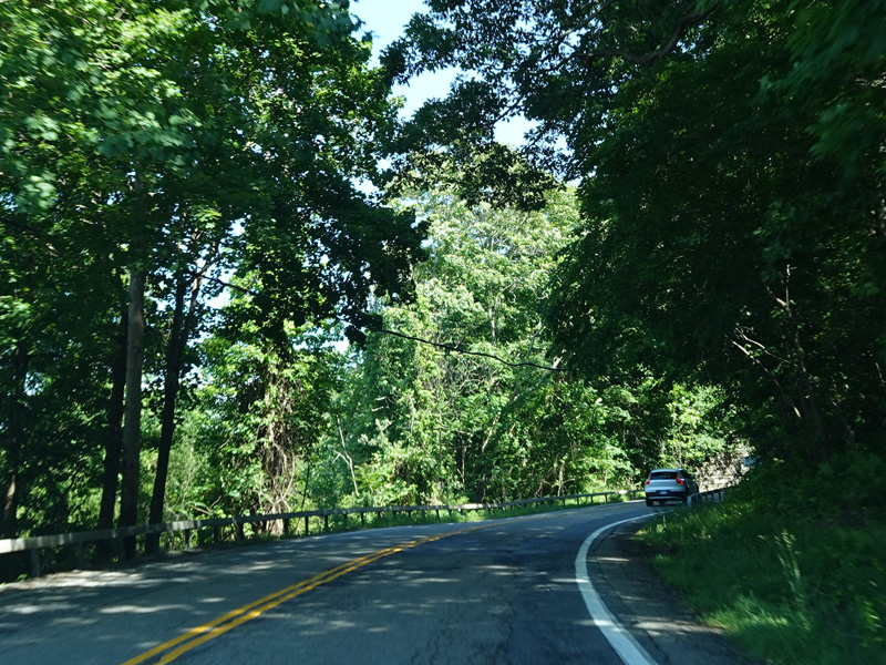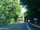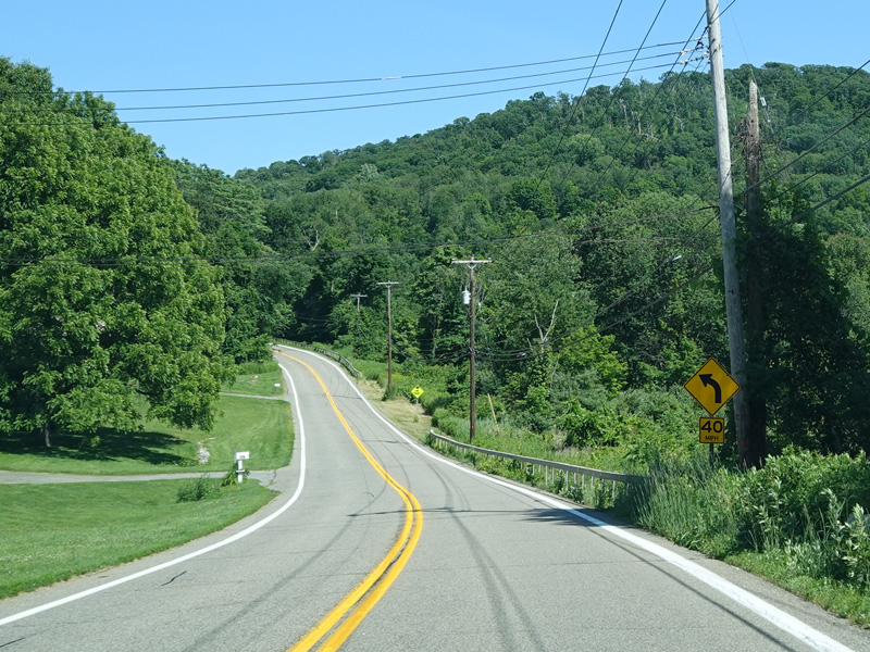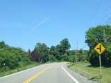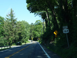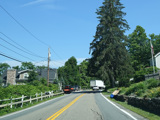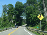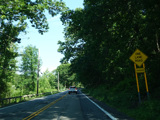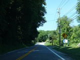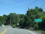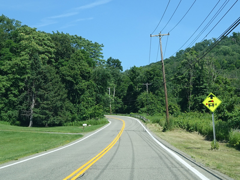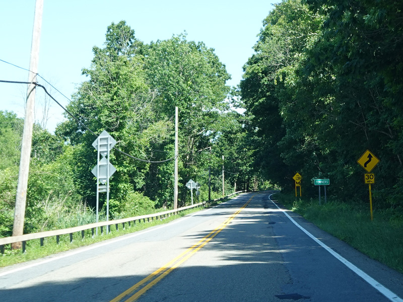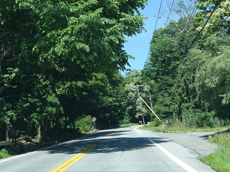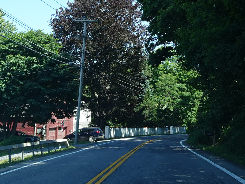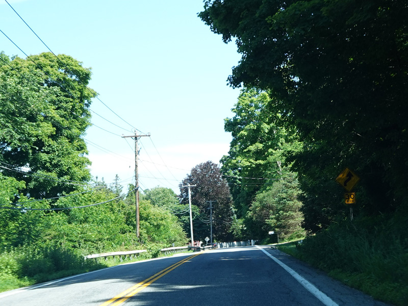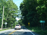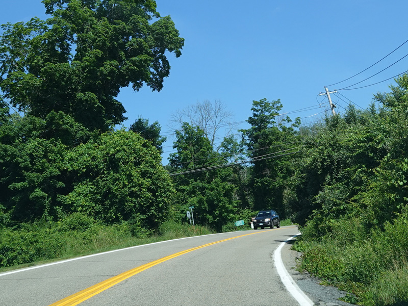 NY 164 begins at NY 311 in Carmel and runs east as a two-lane undivided road. It passes under the Beacon Line of the Metro-North Railroad twice. The signs warn of one-lane bridges, but it is not the bridges themselves that have one lane but rather the road passing under them that narrows to a single lane each time it crosses the tracks.
