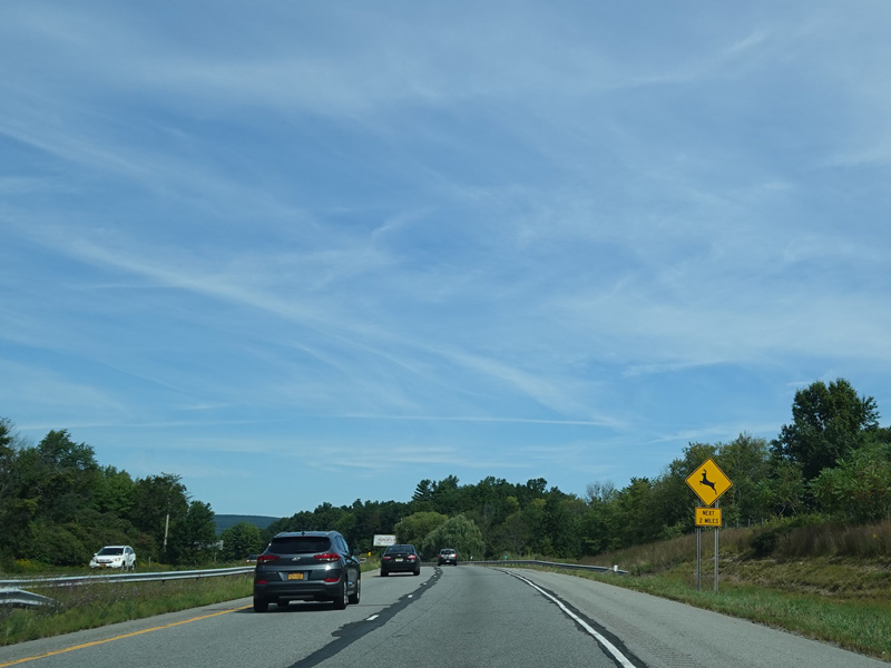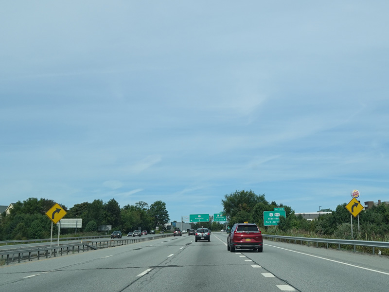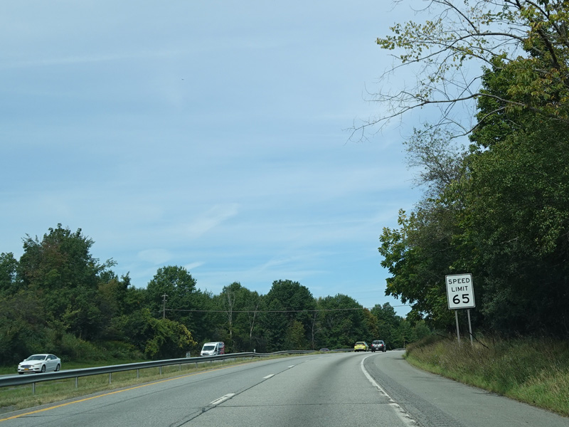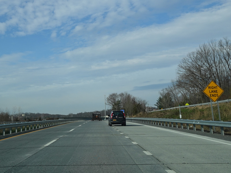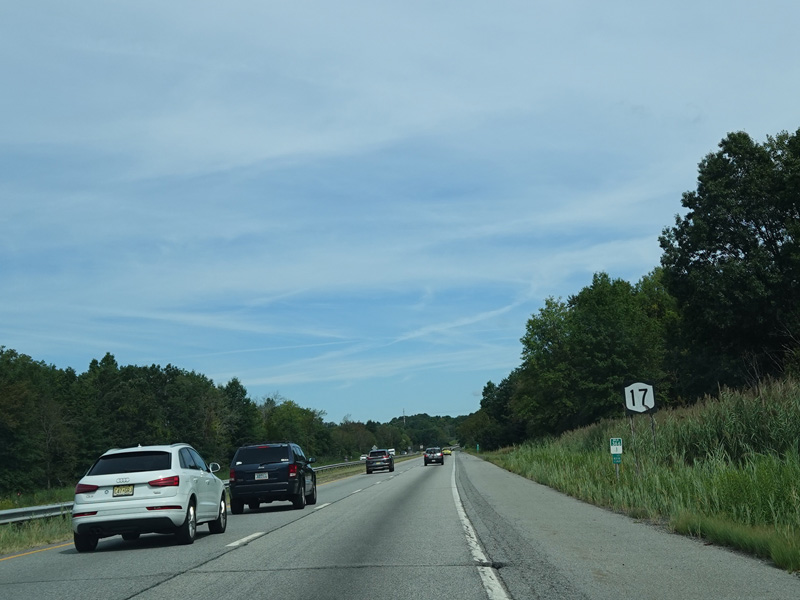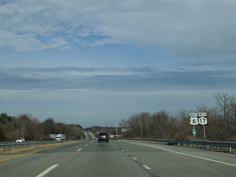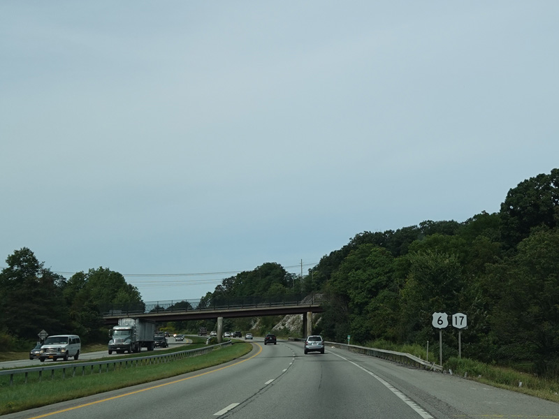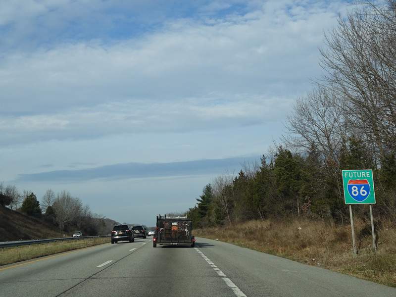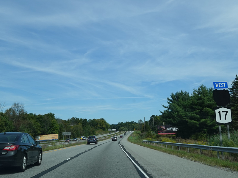 The Quickway takes on the NY 17 designation one exit west of its eastern terminus at the New York Thruway (I-87). US 6 merges in after a short distance. There is a Future I-86 sign to indicate that the Quickway will be redesignated I-86 once it is upgraded to meet interstate standards.
