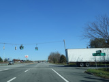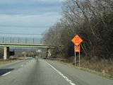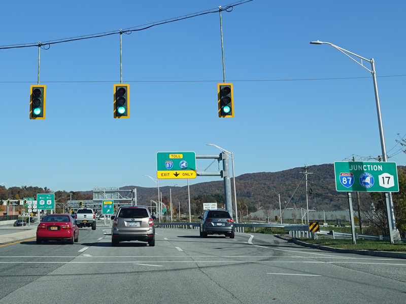There is a diverging diamond interchange with the Quickway (NY 17/Future I-86). The northbound and southbound lanes cross over each other twice at traffic lights so that traffic passes through the interchange on the left side of the road. Exit to the right before the first traffic light to go east toward the New York Thruway (I-87). To stay on NY 17, exit to the left after the first traffic light to go west on the Quickway. NY 32 begins straight ahead.