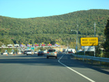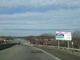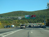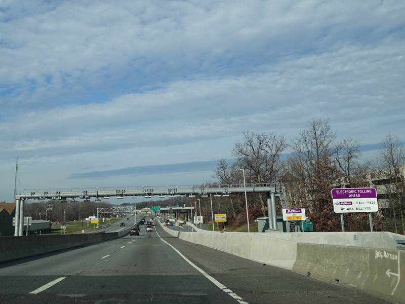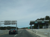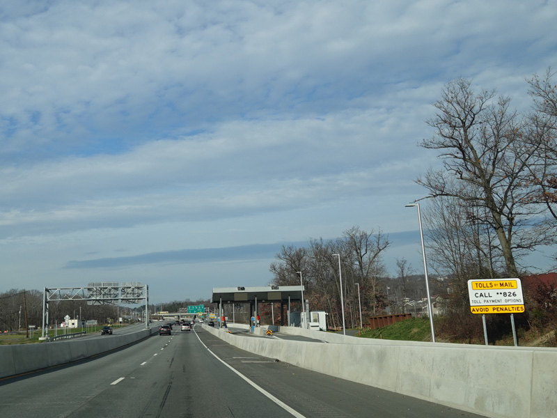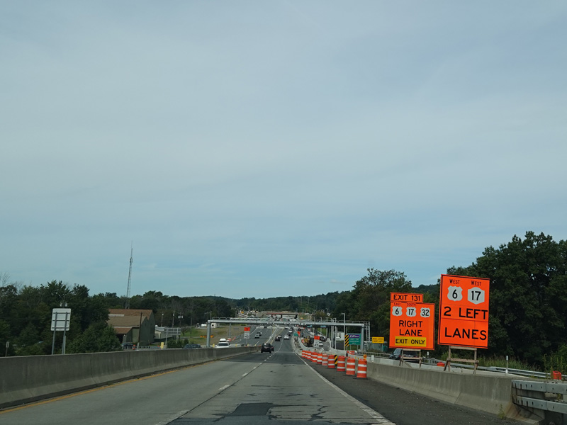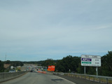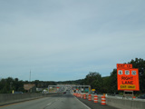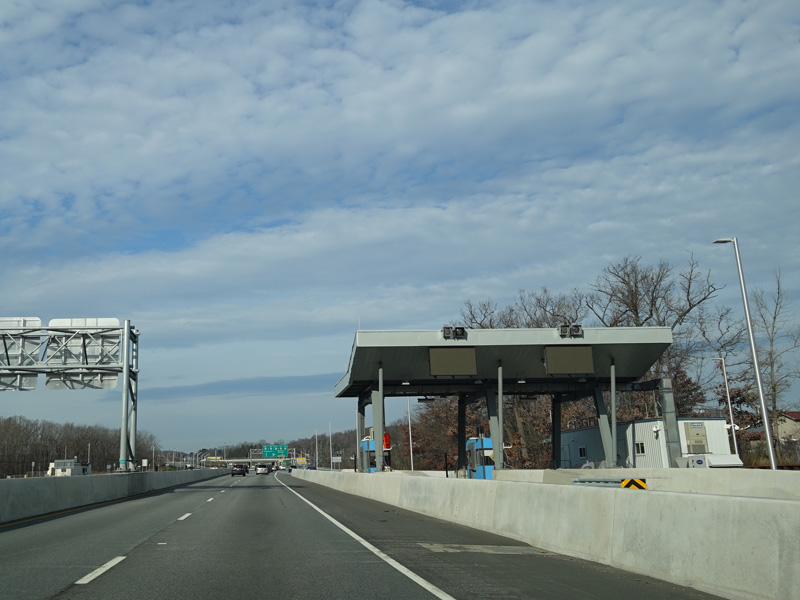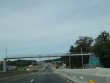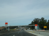 These pictures show the same area as it appeared almost a decade later. At the time, the toll for motorists coming from the south had been converted to cashless tolling, but motorists coming from the north still passed through a tollbooth a handed in their tickets. The old signage for exit 131 had been taken down and replaced by temporary orange signs.
