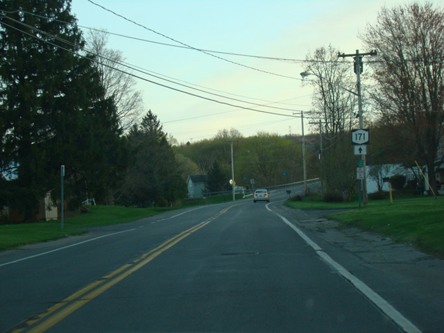 NY 171 is a short east/west route running along Moyer Creek in Frankfort. It is the only state route in New York that does connect to any other state route, unless one counts the section of NY 878 in Nassau County. This situation arose because the eastern terminus of NY 171 is at the original alignment of NY 5S prior to the construction of the East-West Arterial Highway. When the arterial was built, NY 5S was decommissioned along East Main Street and West Main Street through Frankfort, leaving NY 171 as a floating segment.