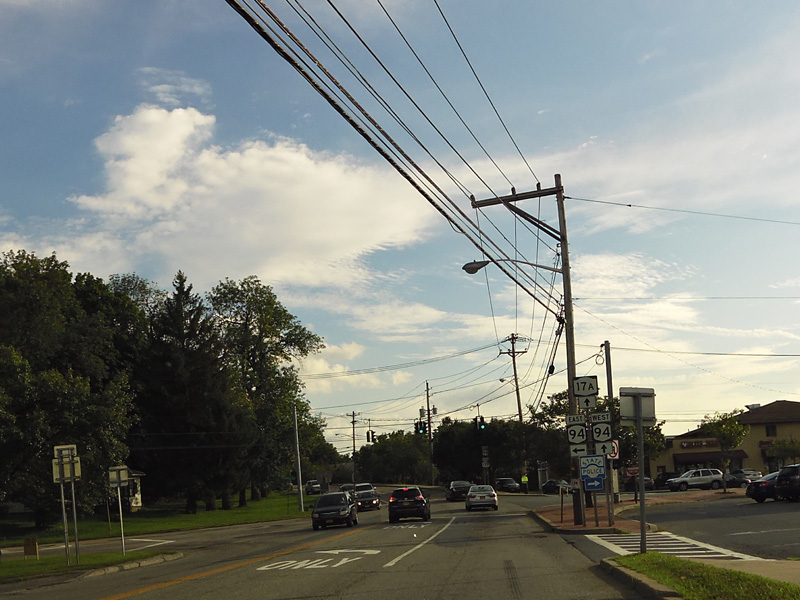 The median ends, and NY 17A narrows back down to two lanes and ends at a grade-separated interchange with Orange Turnpike (NY 17). Kanawauke Road (CR 106) is straight ahead.