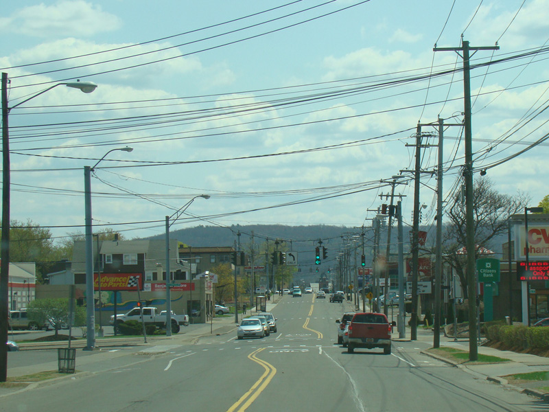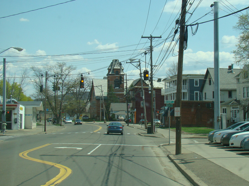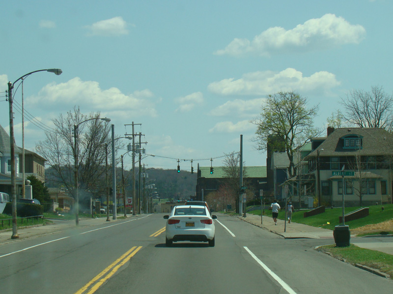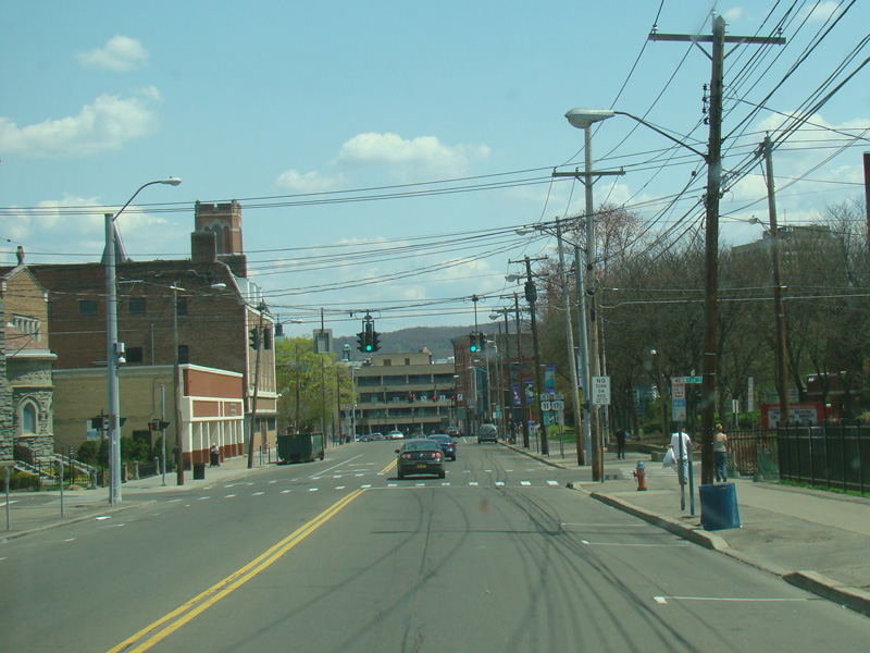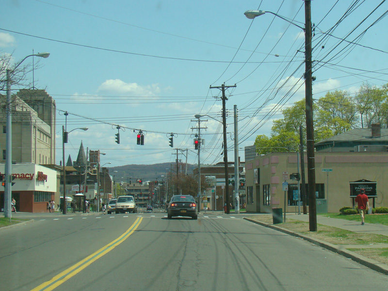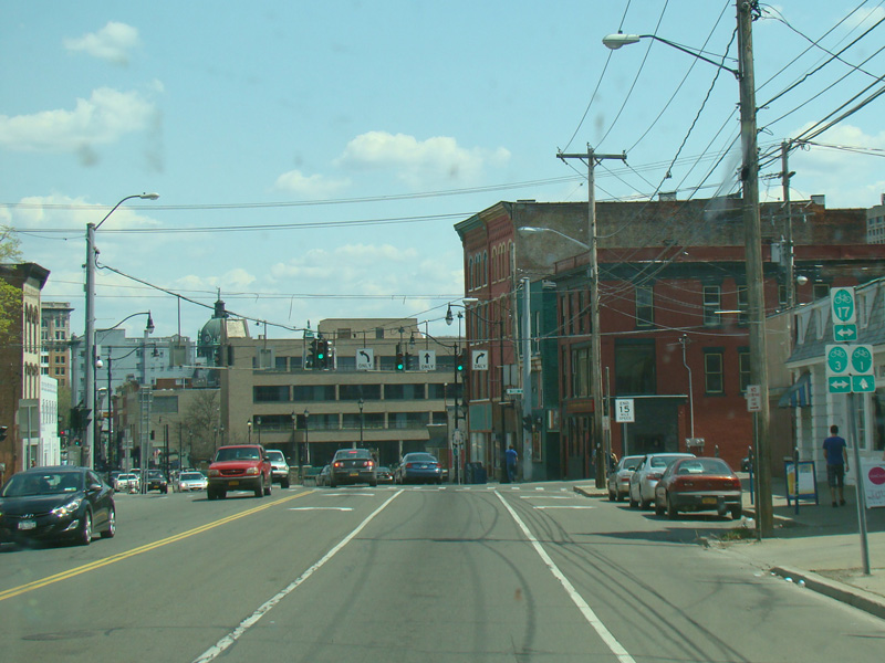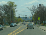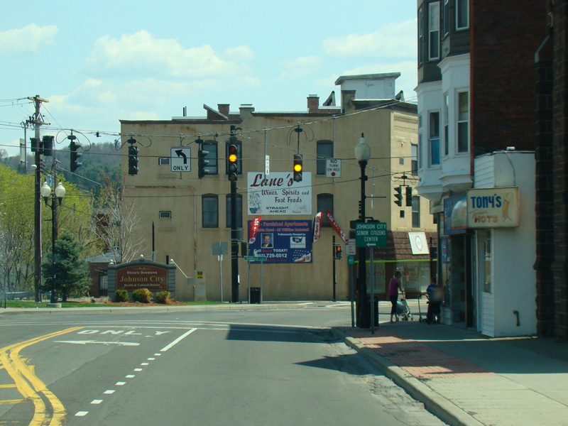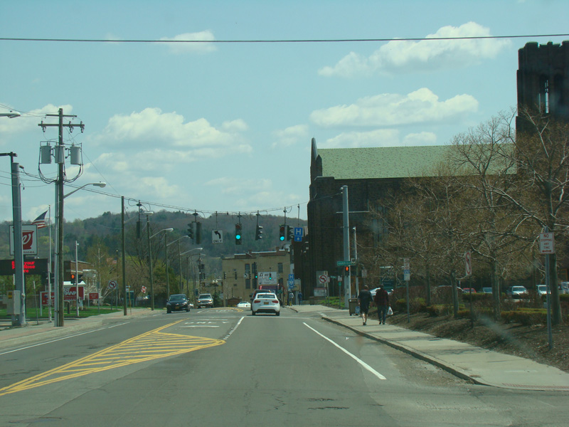 Main Street ends here at US 11. Turn left onto Front Street to go north or continue straight ahead onto Court Street to go south.