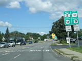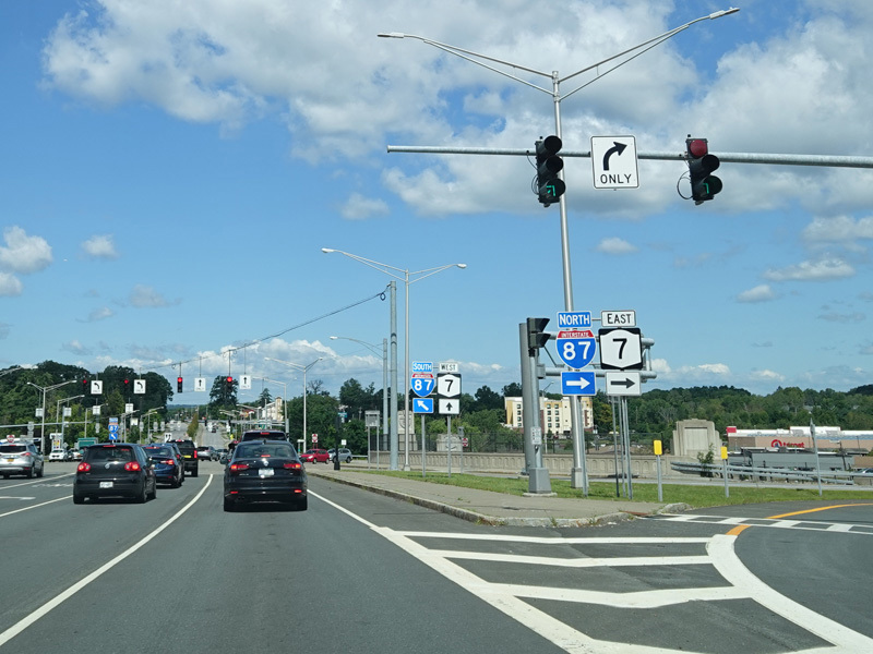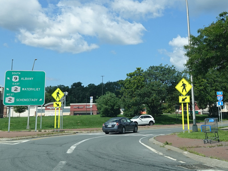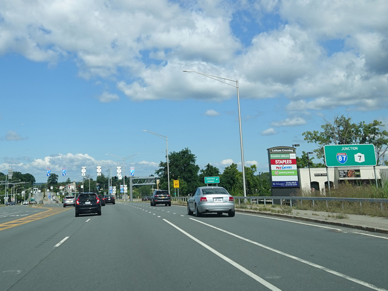 There is an interchange with the Northway (I-87). NY 2 ends here, and Troy-Schenectady Road continues straight ahead as NY 7. Westbound NY 7 is multiplexed along the Northway (I-87) for one exit to the north.