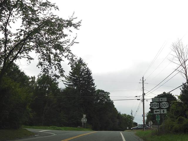 NY 207 is an east/west route in Orange County. Greenwich Avenue changes designation from NY 17A to NY 207 upon crossing the Quickway (NY 17/US 6/Future I-86). It runs northeast to Campbell Hall and then curves to the east. It runs along the southern boundaries of Stewart State Forest and Stewart Airport. Just past the airport, it crosses the New York Thruway (I-87), but there is no interchange. It then merges with NY 300. The two routes are multiplexed for about half a mile, and then they split. NY 207 curves to the northeast to end at Broadway (NY 17K) in Newburgh.