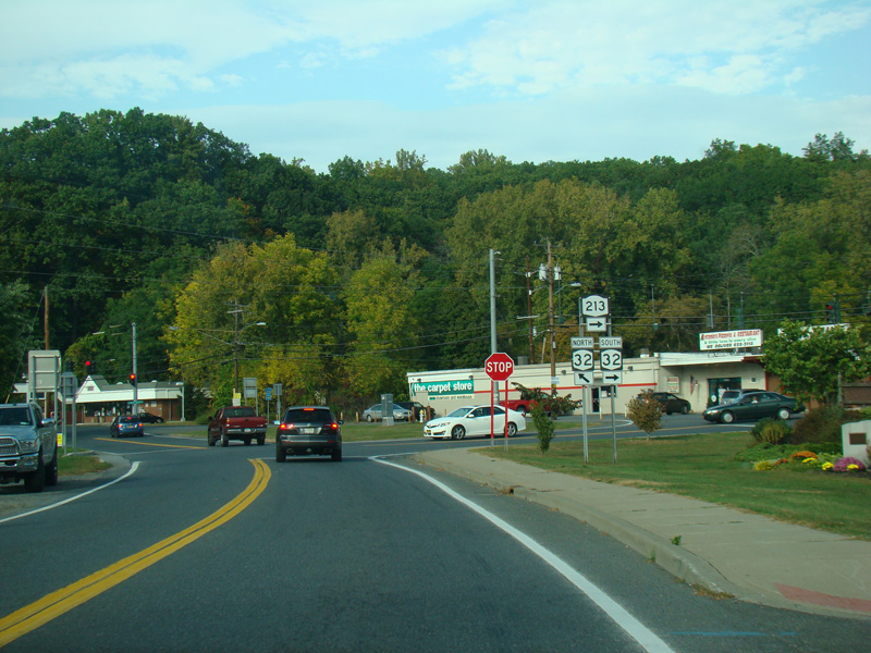NY 213 splits off from NY 32 and runs northeast as a two-lane undivided road.