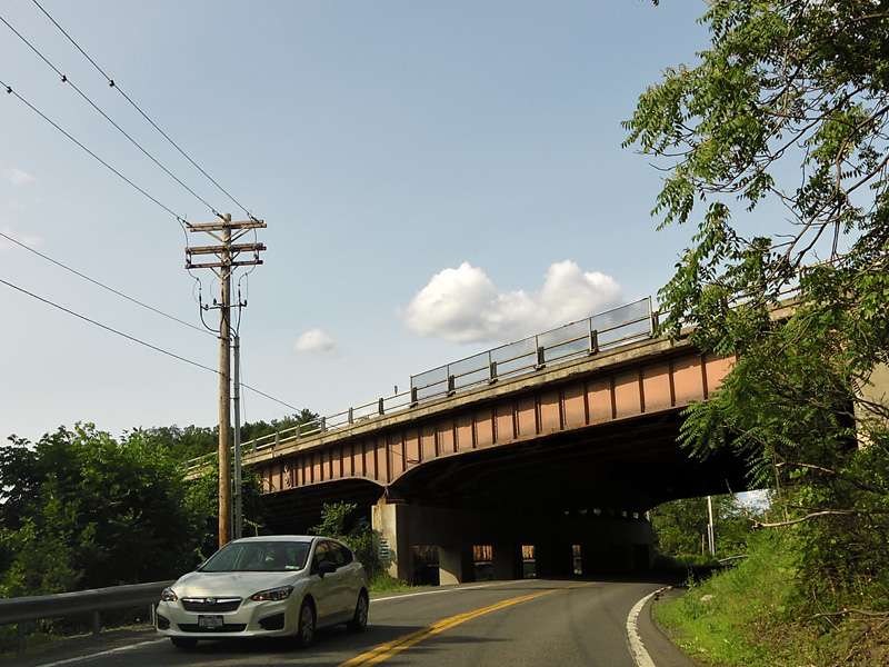 Main Street passes under the Rosendale Trestle, which carries the Wallkill Valley Rail Trail.