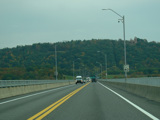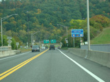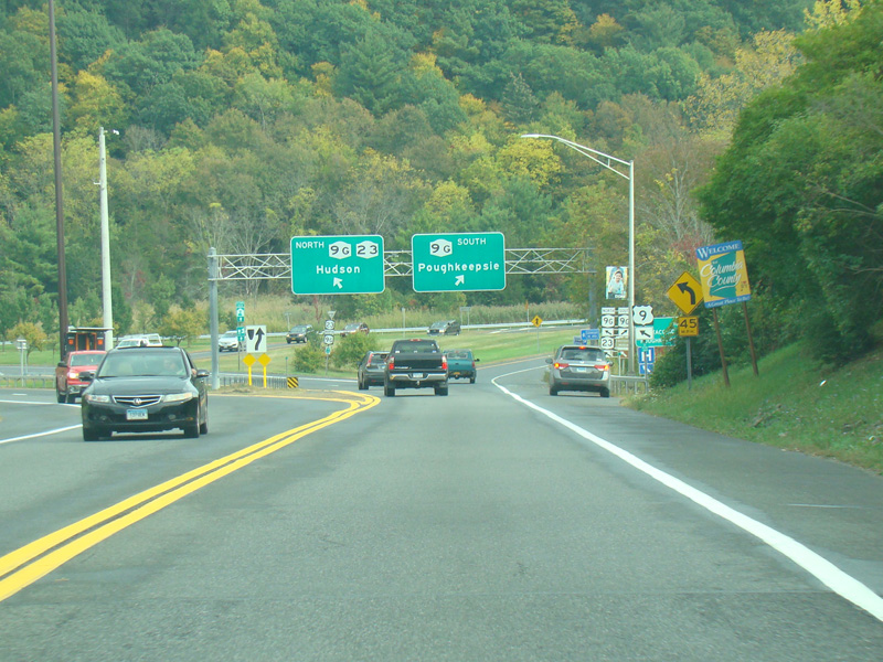 On the other side of the bridge, the roadway splits. Bear right to go south on NY 9G. Bear left to go north and to stay on NY 23.