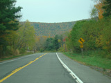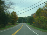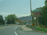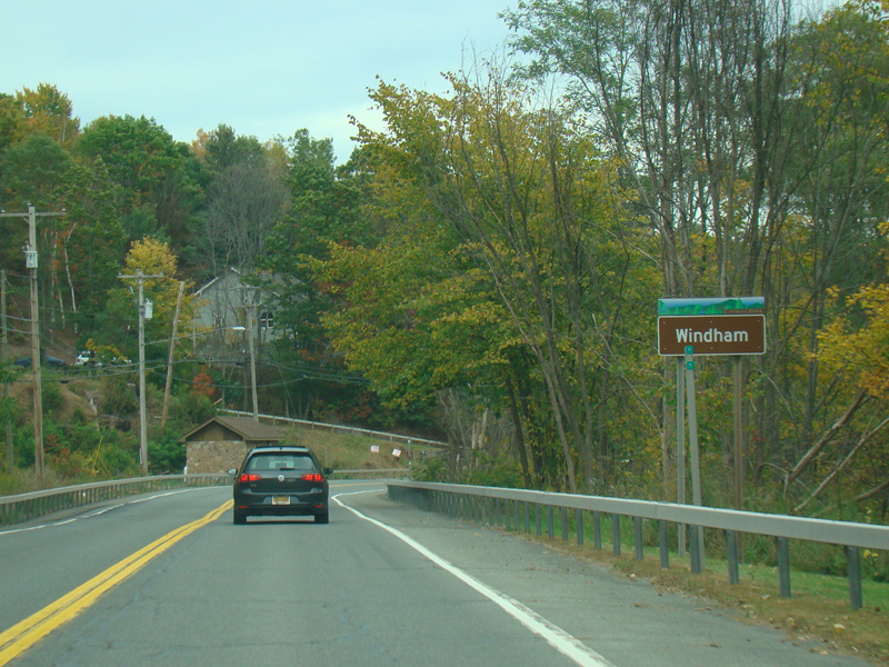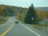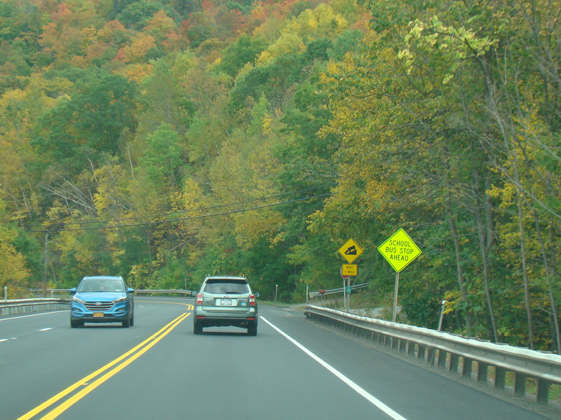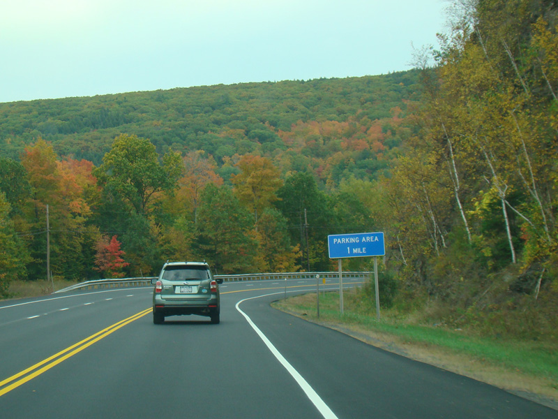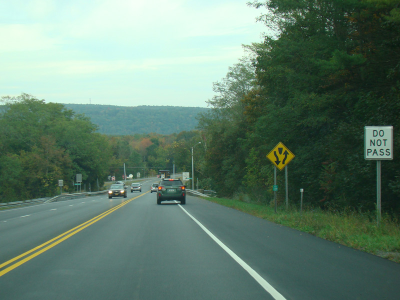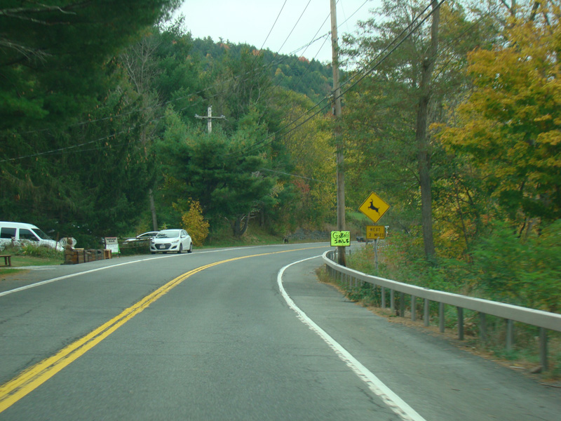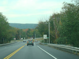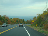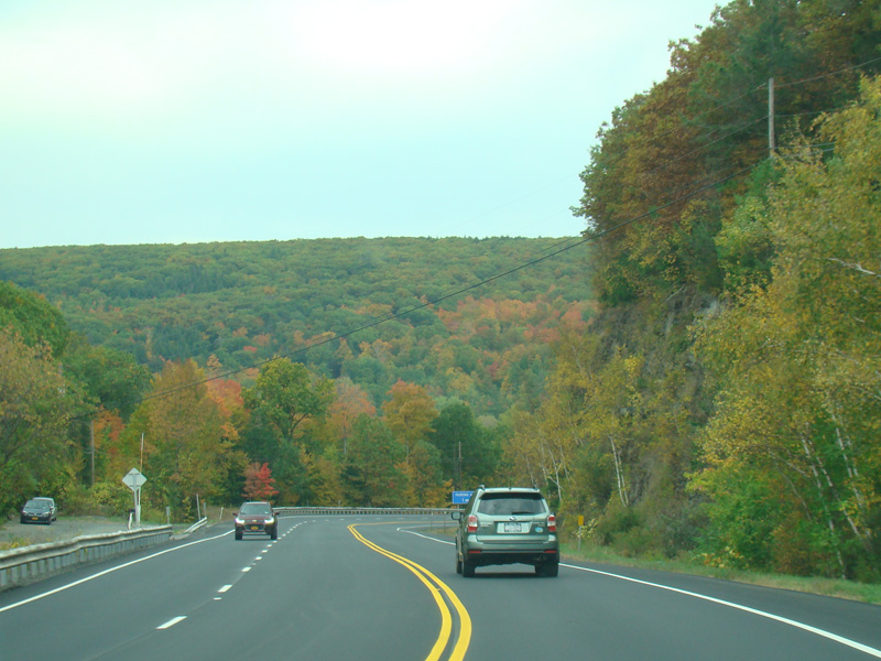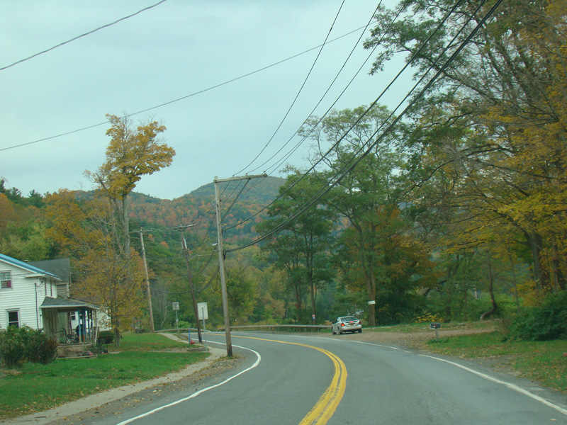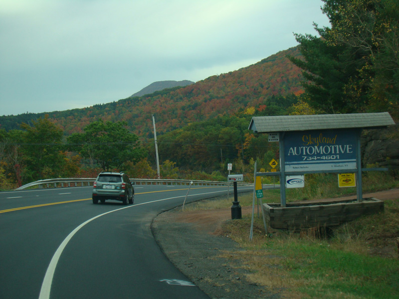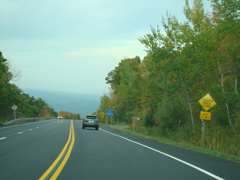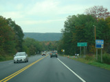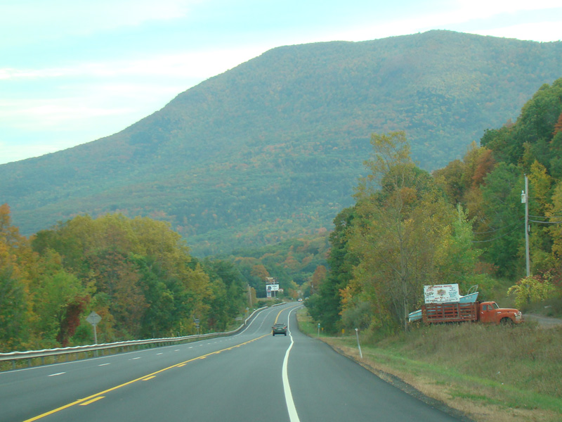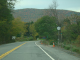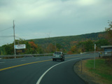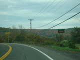 Welcome to the Town of Durham! NY 23 gets a second westbound lane. It gradually descends down into the valley below over the course of several miles. There is a parking area with a scenic overlook on the left.