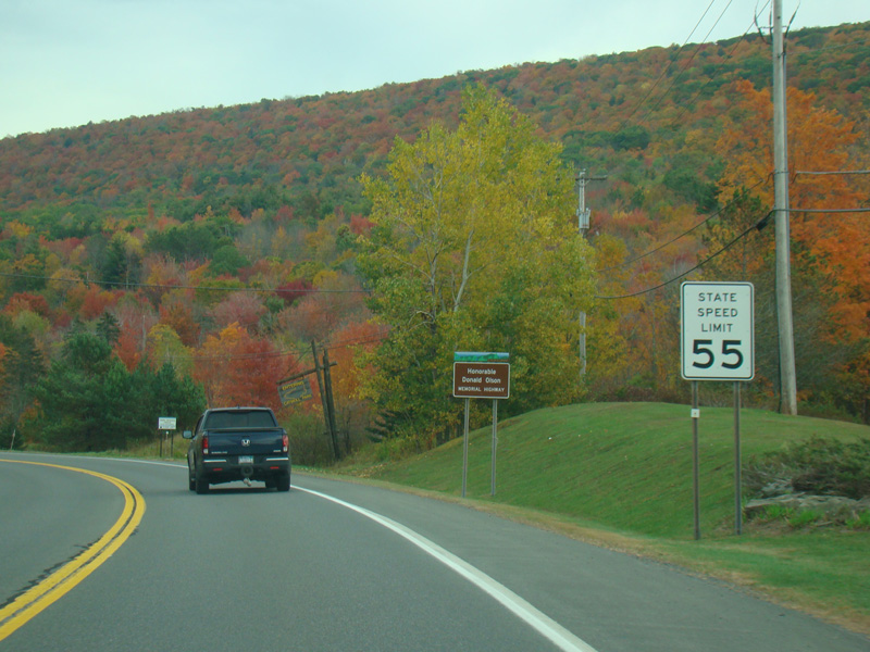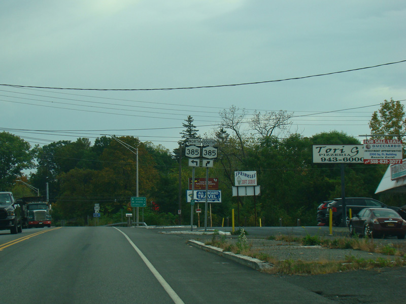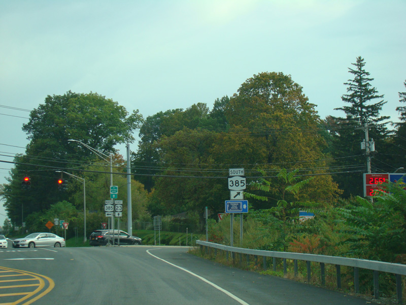 There is a traffic light at NY 385. Turn left to go north or right to go south.