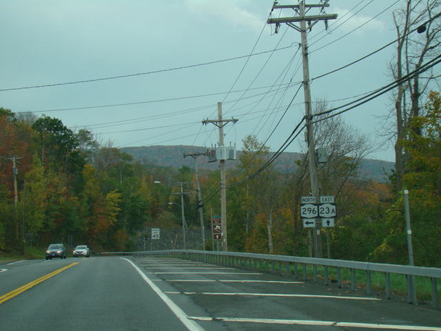 NY 23A is an east/west route in the Catskills. It begins at NY 23 in Prattsville and runs east along the north side of Schoharie Creek. It ends at US 9W in Catskill near the Hudson River. The entire length is a two-lane undivided road. The section in the vicinity of Tannersville is known as Main Street. Elsewhere, it has no name and is known solely by its number.