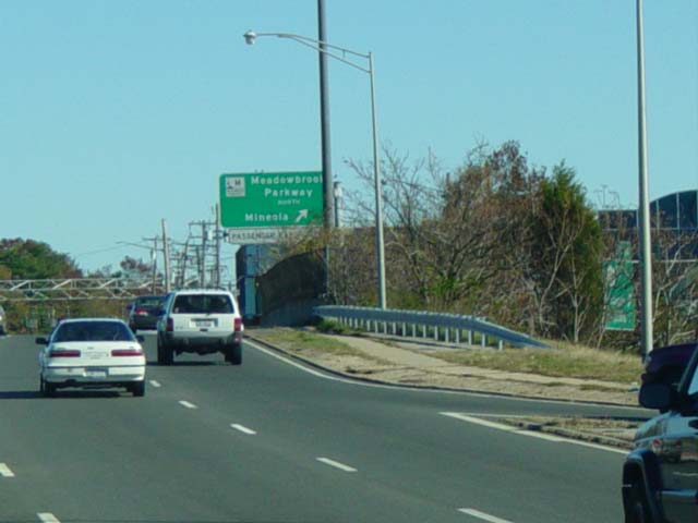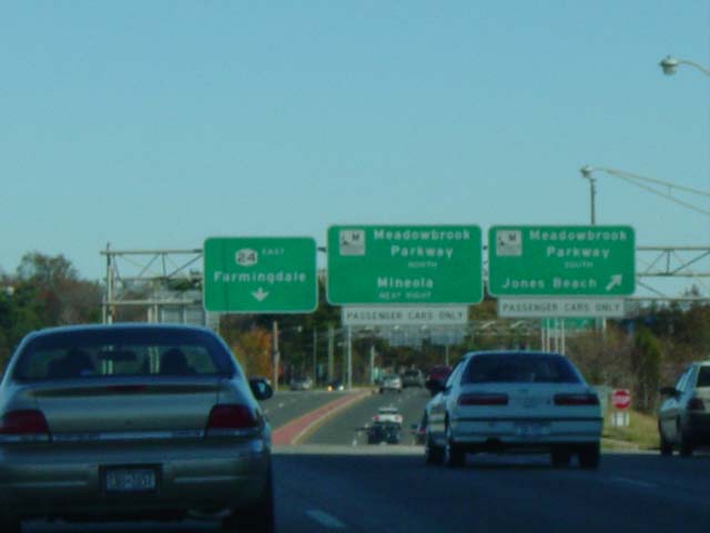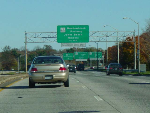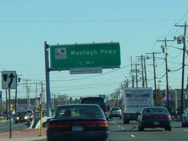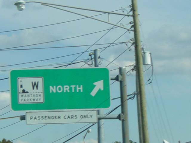 These old "Passenger Cars Only" signs used to mark the interchange with the Wantagh Parkway. They have been replaced with new "No Commercial Vehicles" signs.