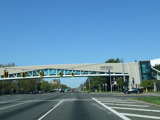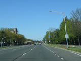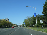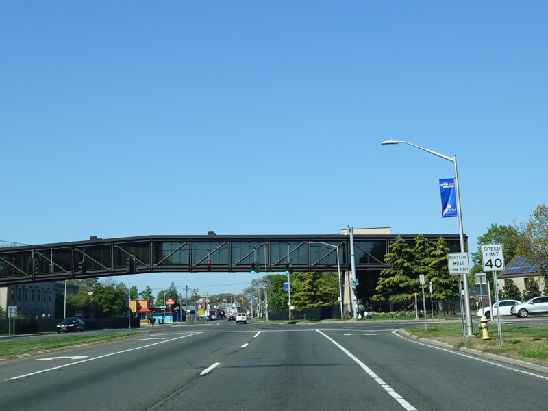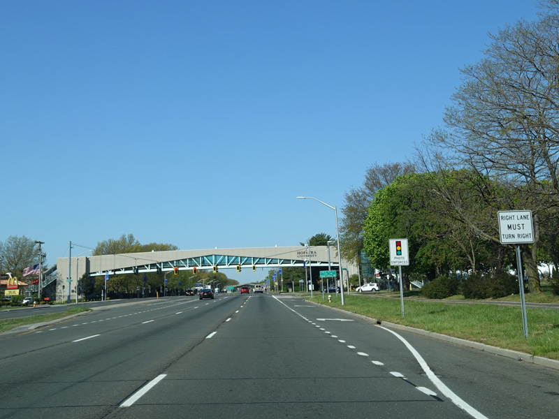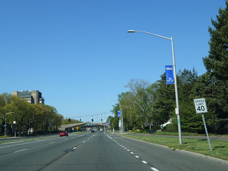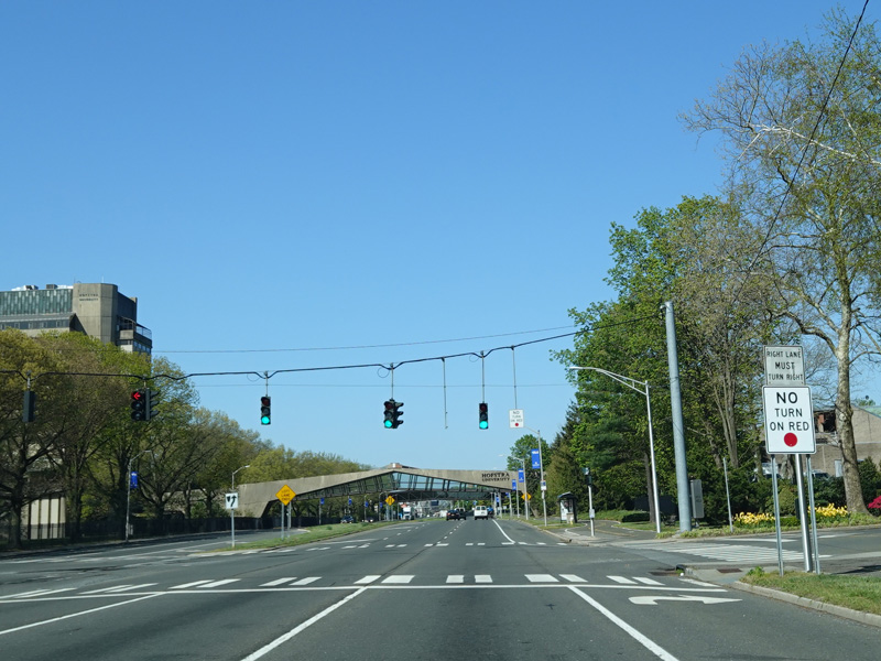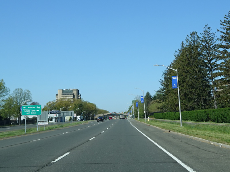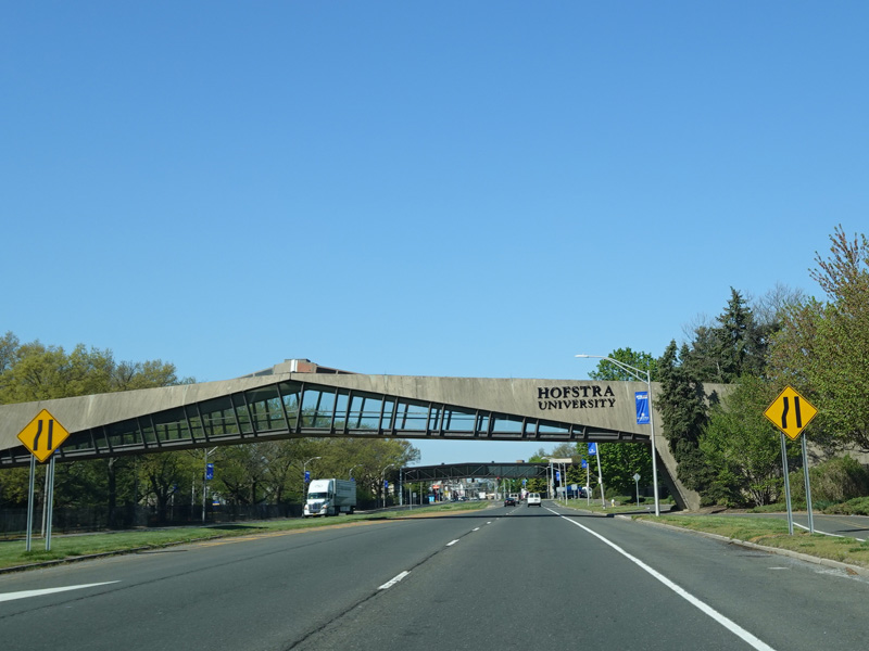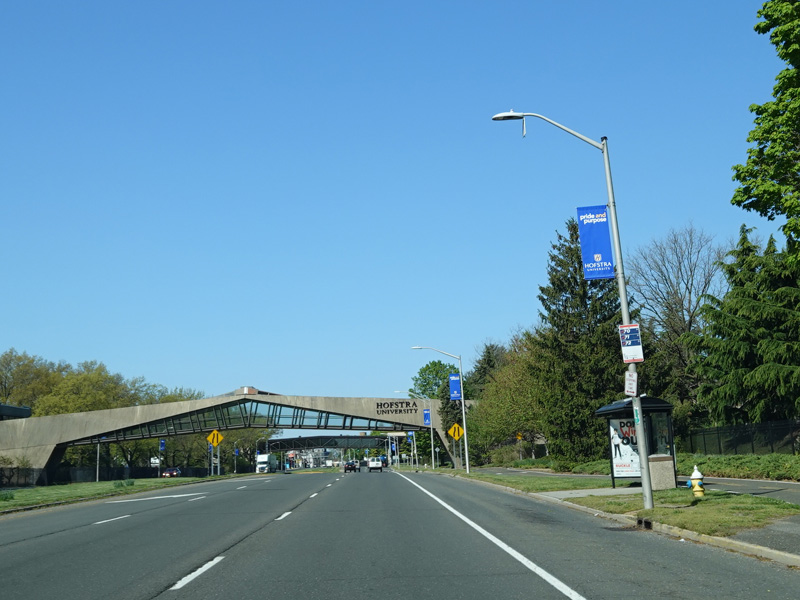 Hempstead Turnpike passes through the campus of Hofstra University. There are three pedestrian overpasses connecting the northern and southern halves of the campus. There is a traffic light at California Avenue and Hofstra Boulevard. Hempstead Turnpike narrows down to four lanes as it passes through the campus.