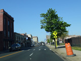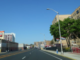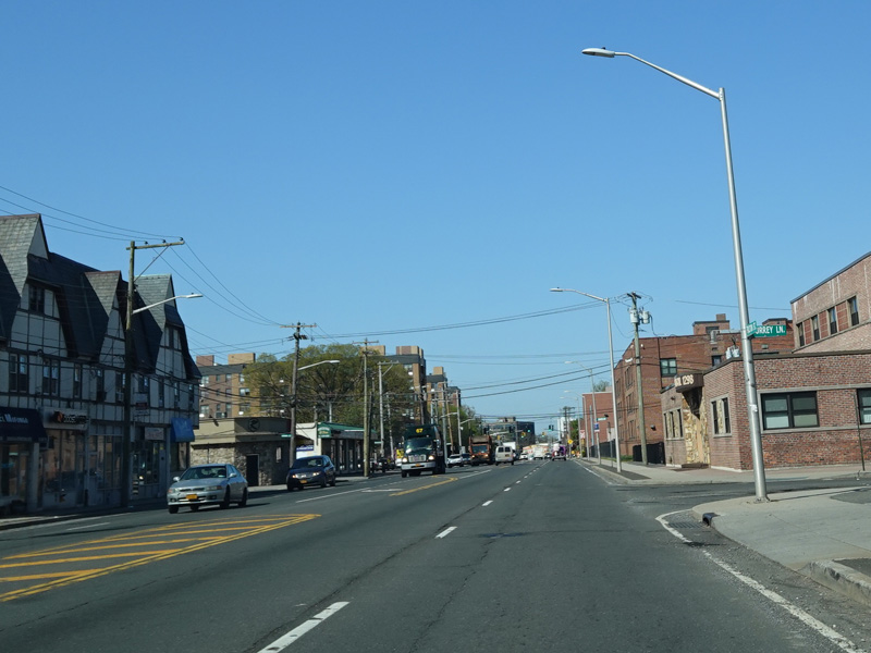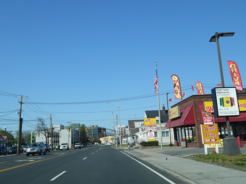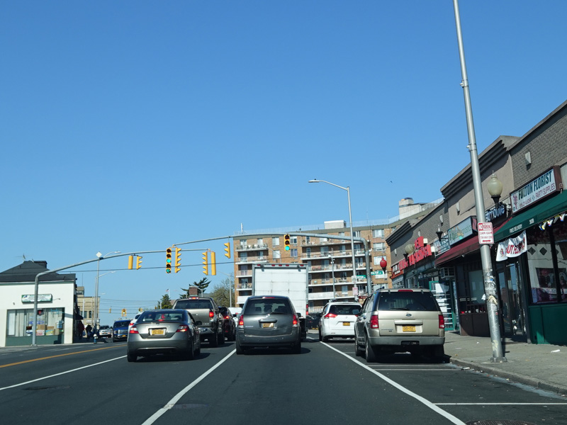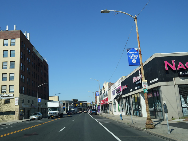 Coming into Hempstead, the median ends. The section of Hempstead Turnpike in Hempstead is known as Fulton Avenue.