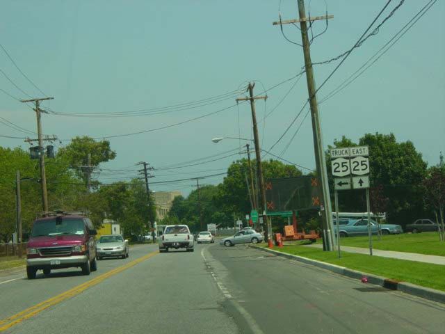 The left half of this sign instructing motorists to turn left for Truck NY 25 has been removed.