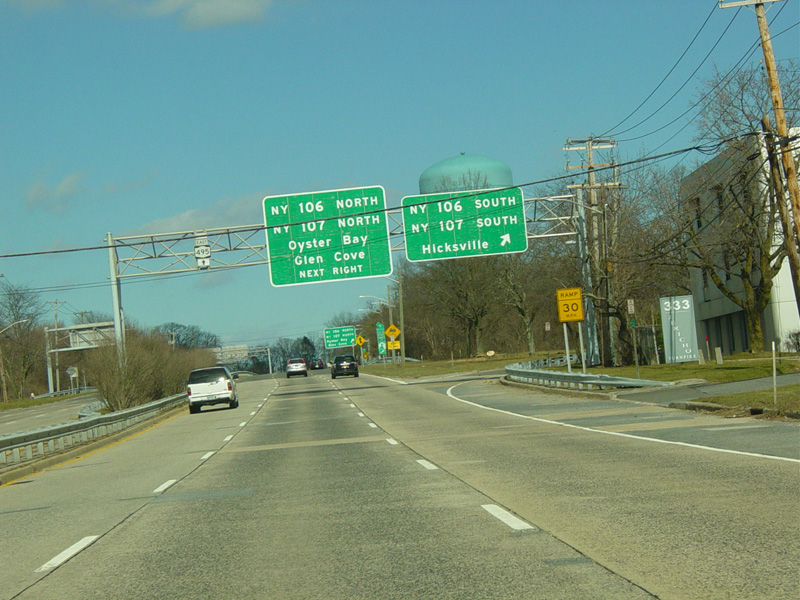 These old button-copy signs used to mark the interchange with Broadway (NY 106/NY 107). They have been replaced with new reflective signs.