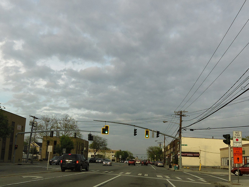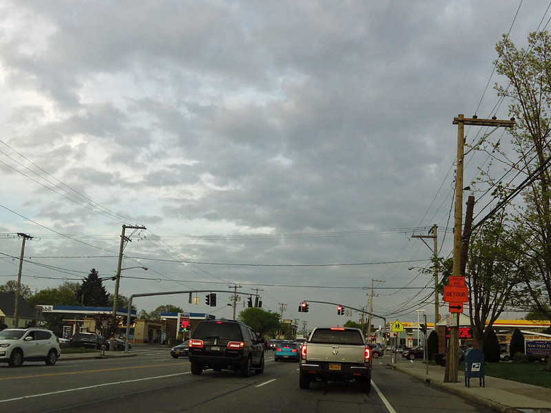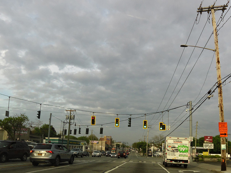 As part of the construction project to add a third track to the Main Line of the Long Island Rail Road, the grade crossing on Covert Avenue was replaced with an overpass. While this work was in progress, Covert Avenue was closed at the crossing. Temporary orange signs on Jericho Turnpike instructed motorists to detour through either Tulip Avenue or New Hyde Park Road (CR 5B).