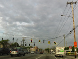 The sign assembly on Main Street in Riverhead is still standing, but the signs have been knocked out of alignment.