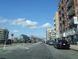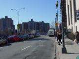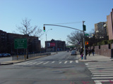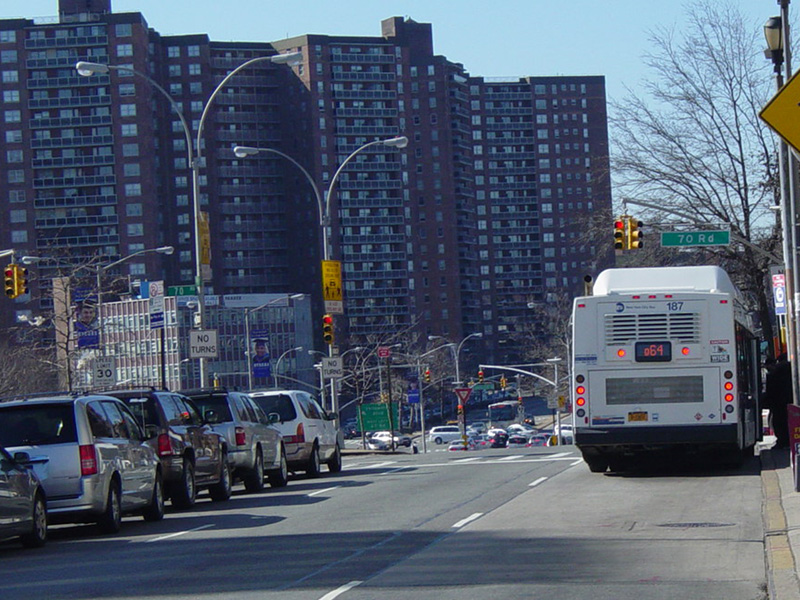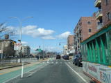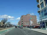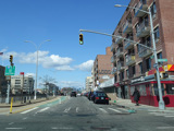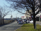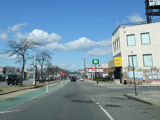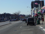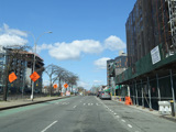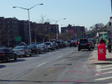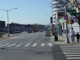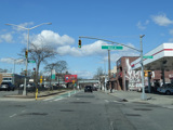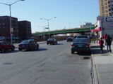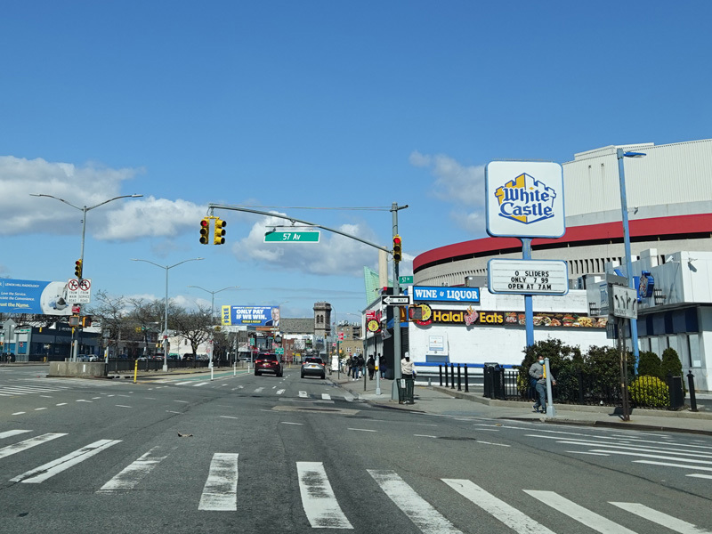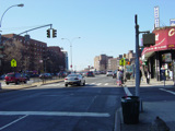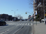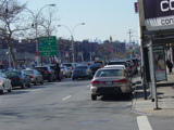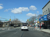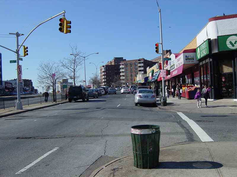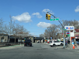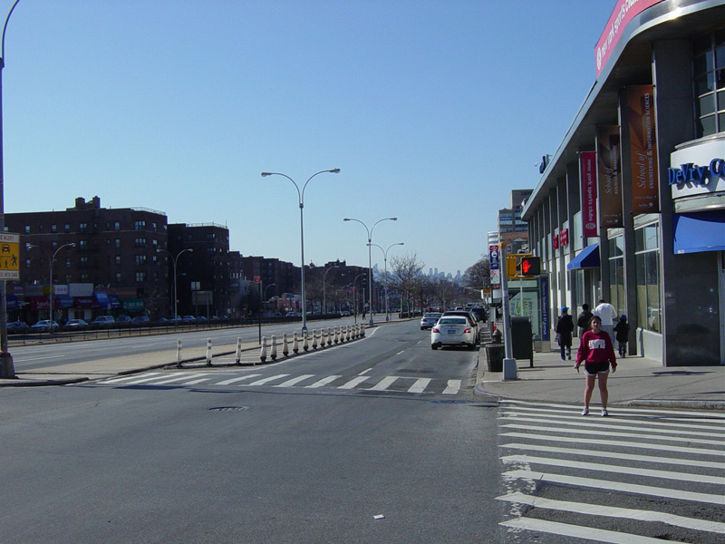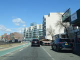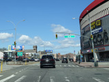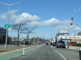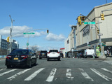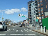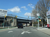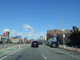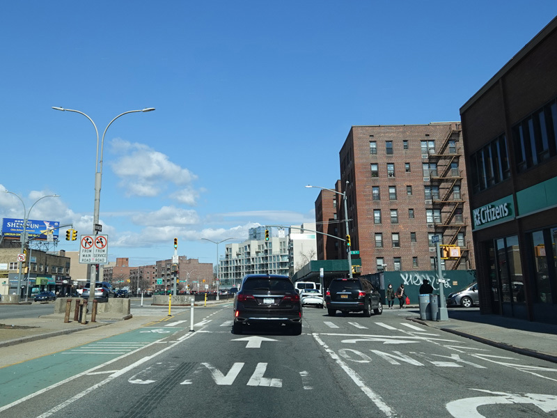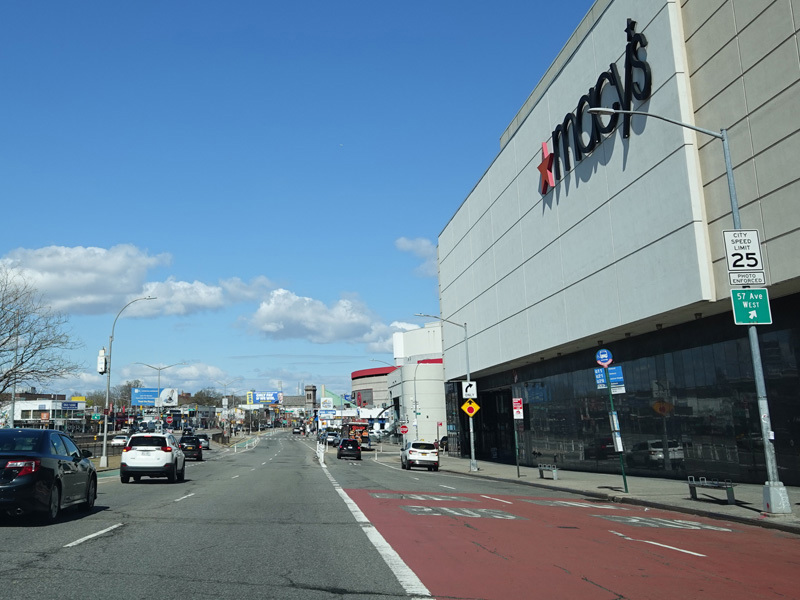 At the first traffic light after the expressway, Woodhaven Boulevard begins on the left. An overpass carries Woodhaven Boulevard over the main road, so there is only access from the service road. The Queens Center Mall is on the right here.