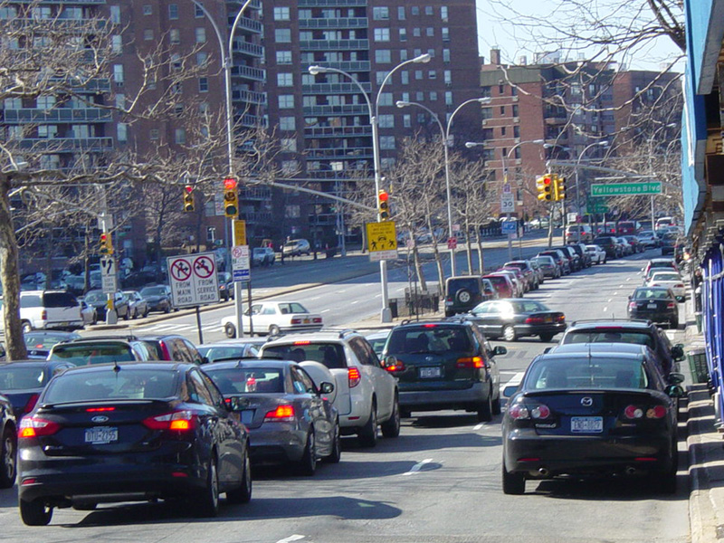 Queens Boulevard has five lanes in each direction. The three inner lanes are considered to form the main road, while the two outer lanes are considered to form the service road. A divider separates the main road from the service road, and there are entrance and exit ramps connecting the two roadways. Right turns are only permitted from the service road. There are oversized street name signs at 108 Street, 70 Road, and Yellowstone Boulevard.