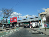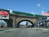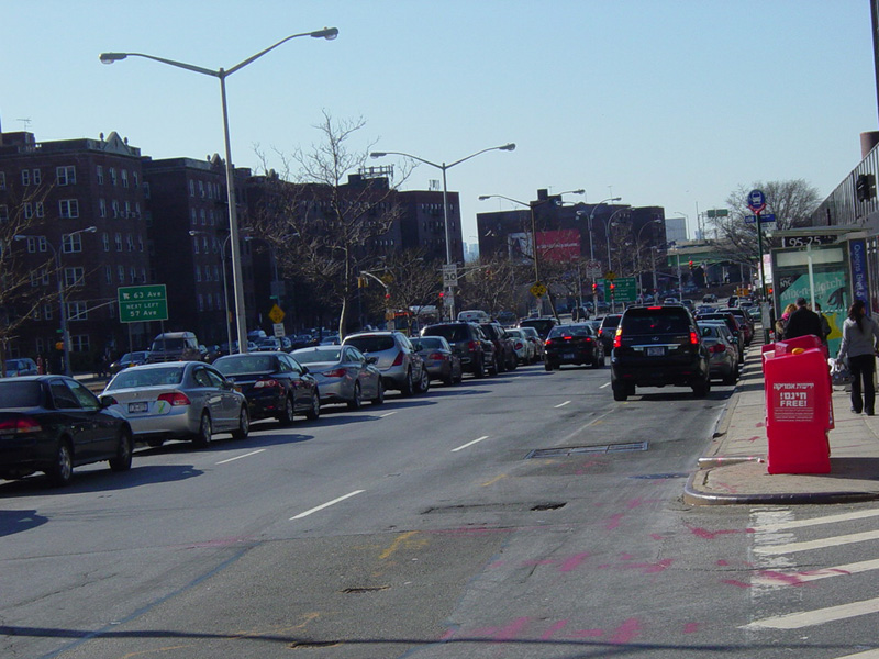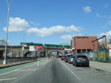 Queens Boulevard passes under the Main Line of the Long Island Rail Road and a freight rail line. There is an exit from the main road to the service road for the Brooklyn-Queens Expressway (I-278) east.