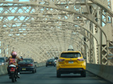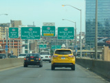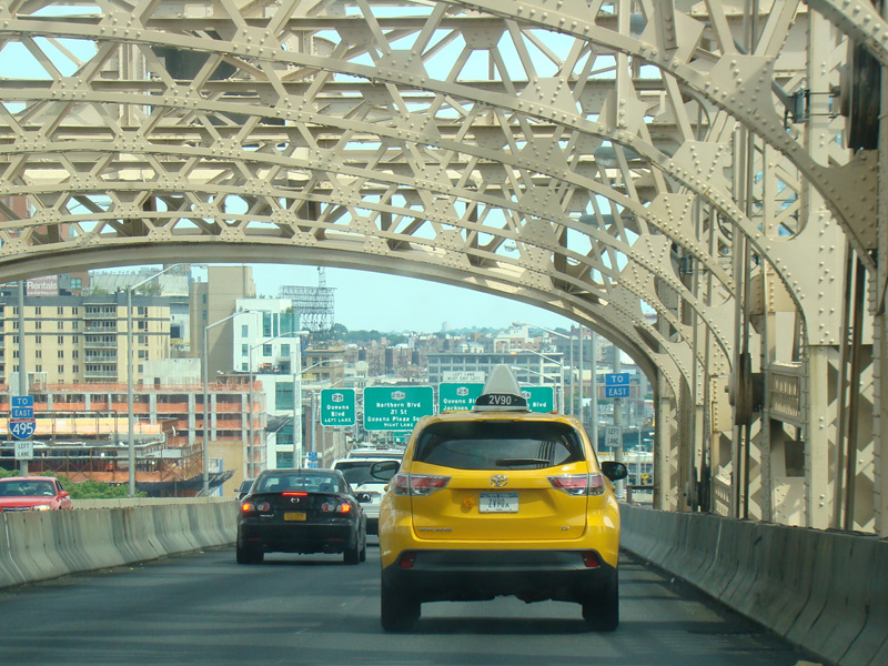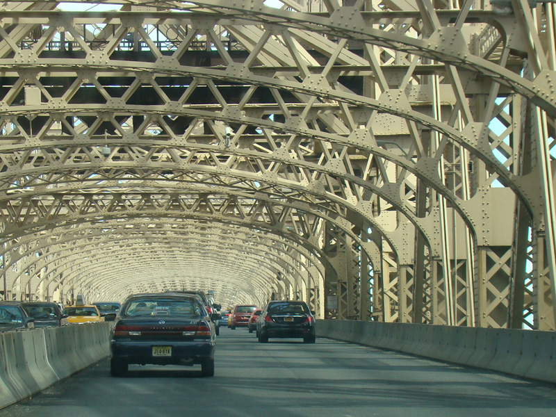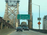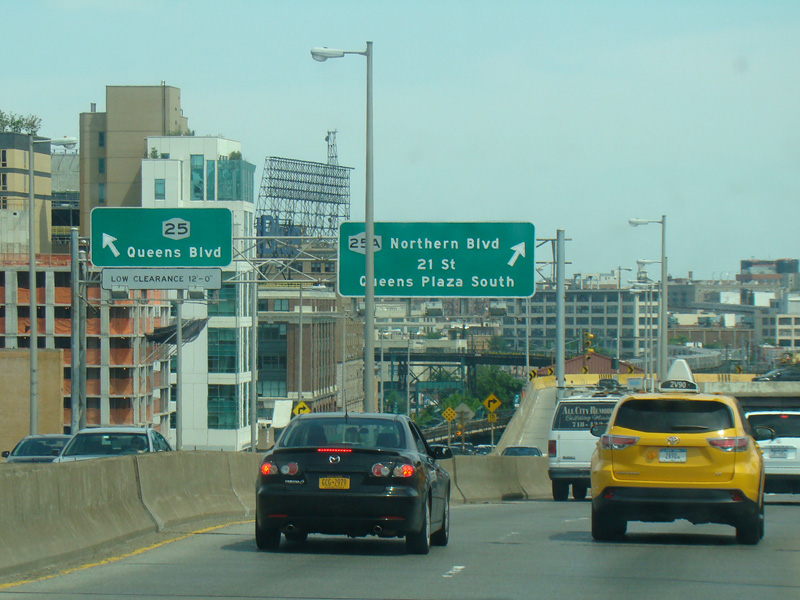 At the end of the bridge, the roadway split. Bear left for Queens Boulevard (NY 25) and Jackson Avenue. Bear right for Northern Boulevard (NY 25A), 21 Street, and Roosevelt Island. Jackson Avenue is part of NY 25A also, but its route number is not posted, presumably because NY 25A ends just west of here and motorists wishing to go east on it should be using Northern Boulevard. Notice that there are signs over the westbound lanes facing in this direction. This is because the lanes are reversible. The upper level of the bridge can be made one-way to alleviate traffic at rush hour.
