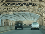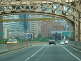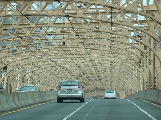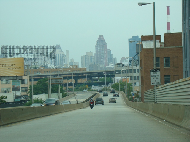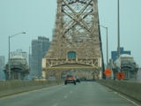 A long ramp runs over Queens from Thomson Avenue to the upper roadway of the bridge.