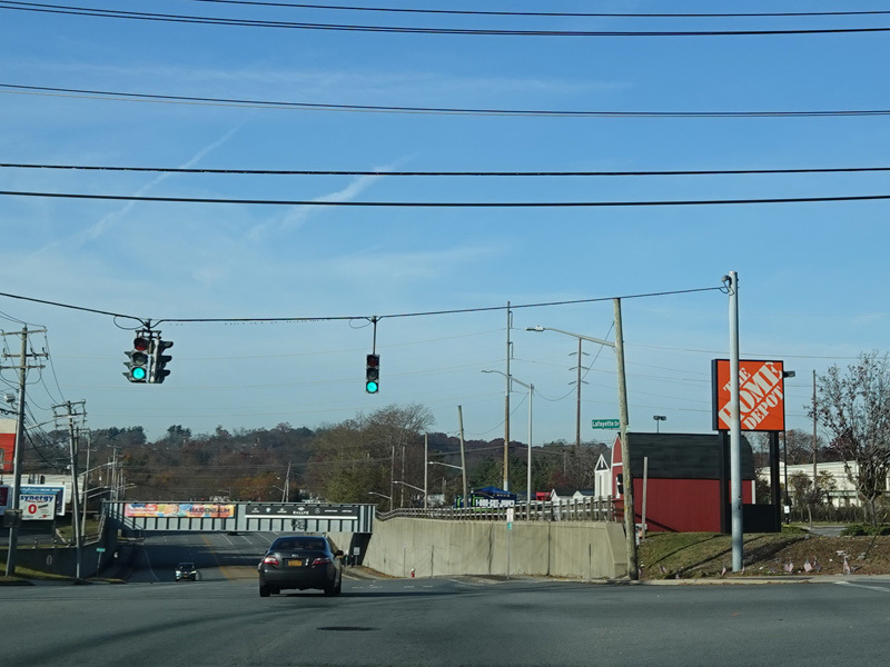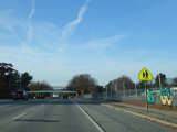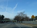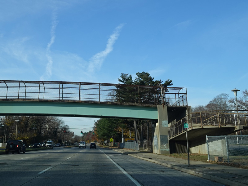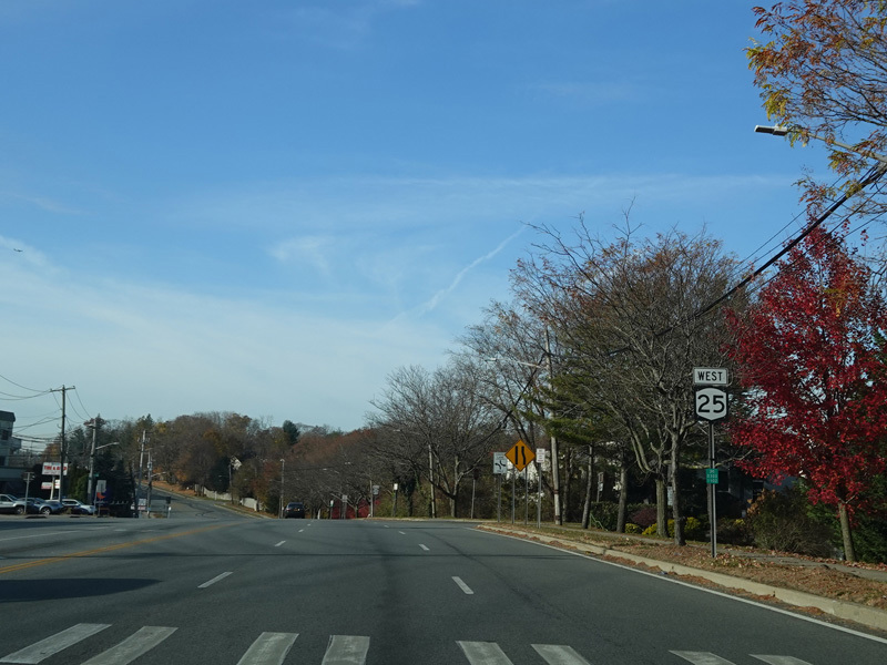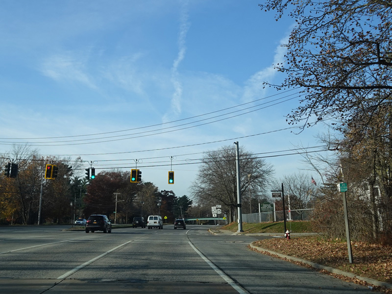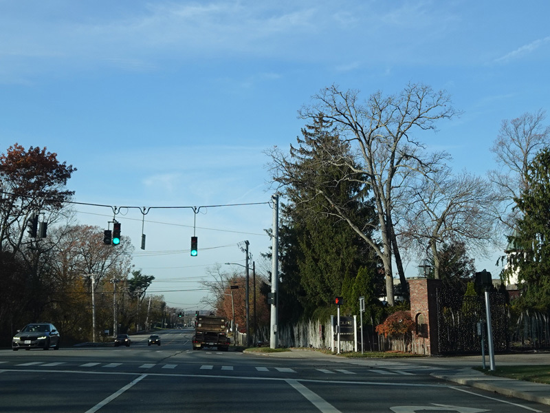 There is a pedestrian overpass at Westbury High School, followed by a traffic light at CR 4. Turn right onto Post Road to go north or left onto Post Avenue to go south.
