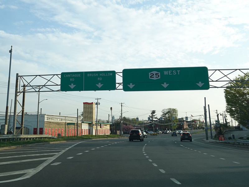 Jericho Turnpike continues straight ahead. Cantiague Road and Brush Hollow Road (CR 63) are to the left.
