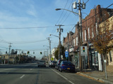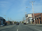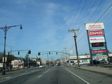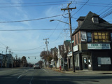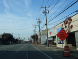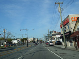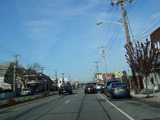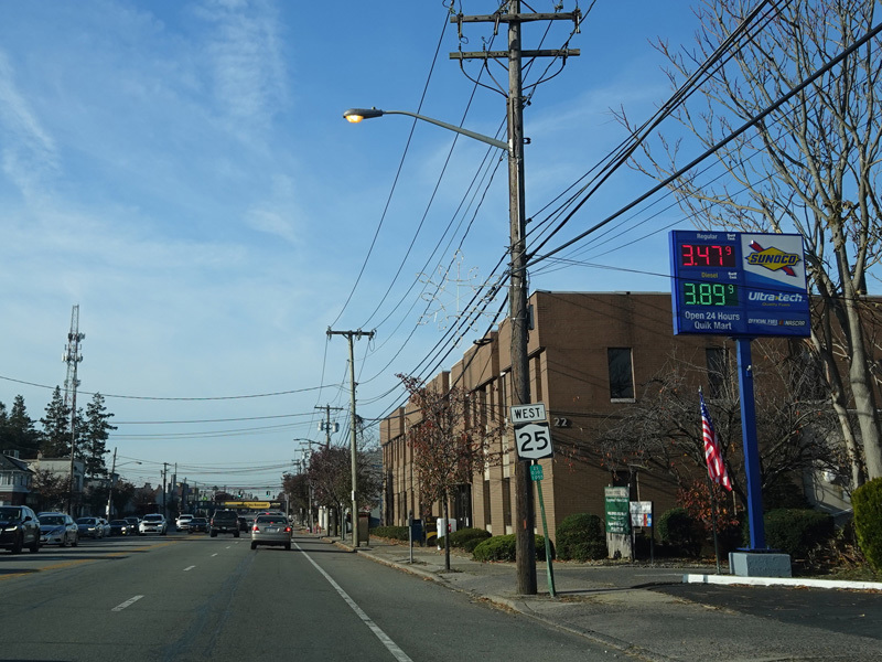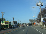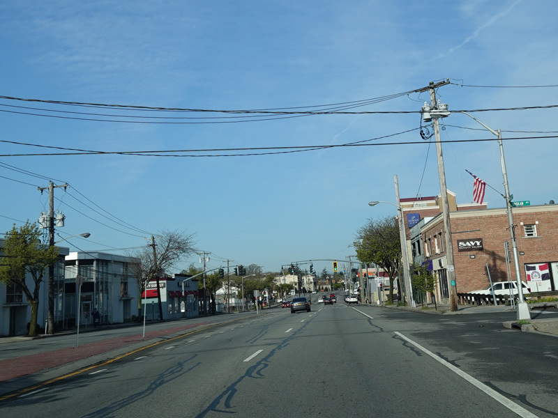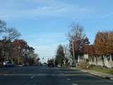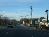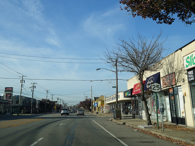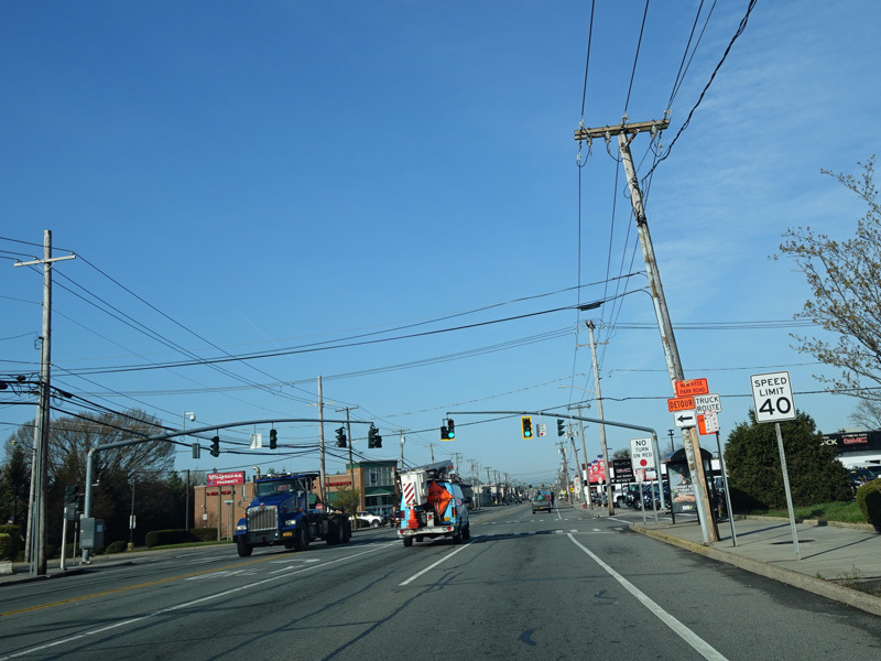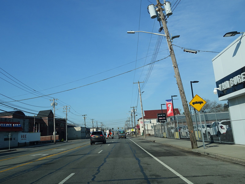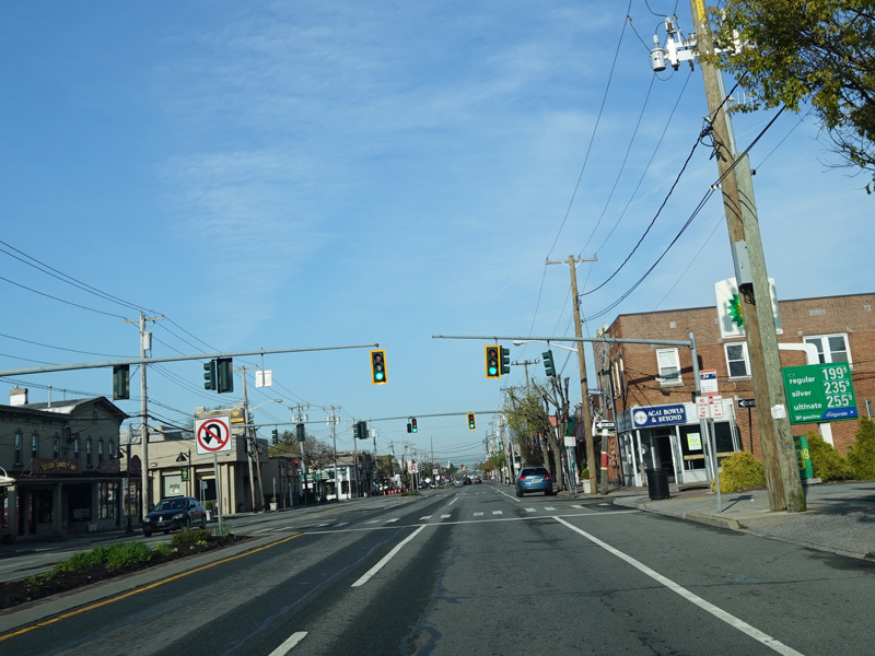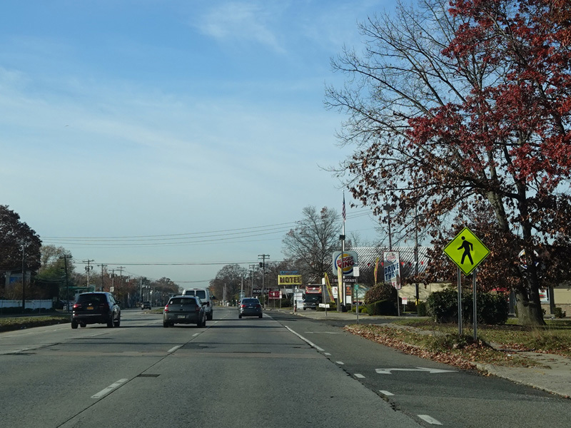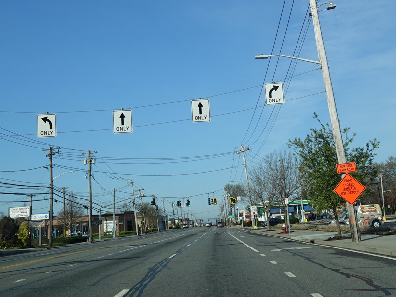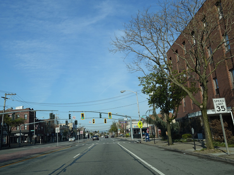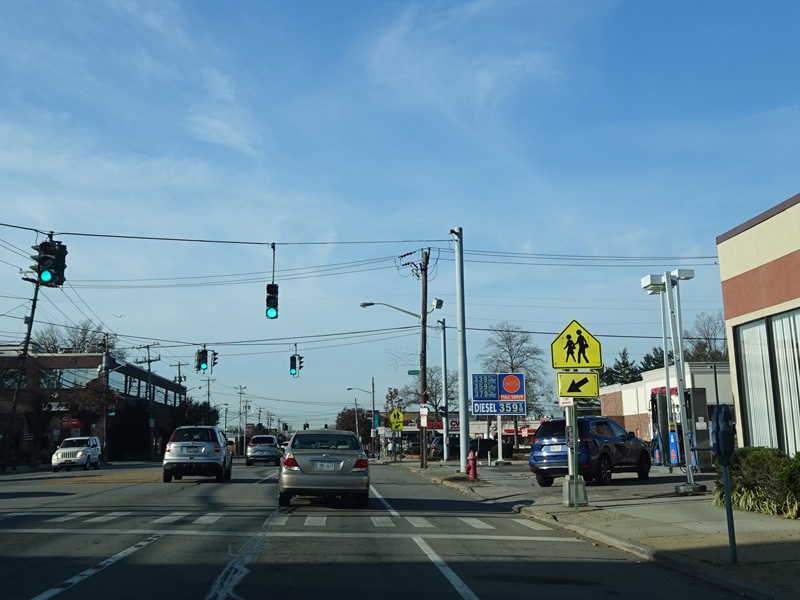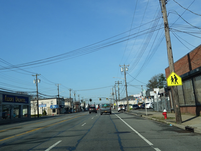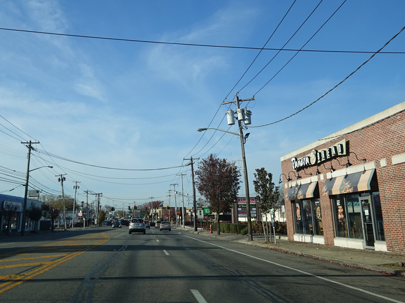 In Mineola, the median ends. Jericho Turnpike runs west as a four-lane undivided road.
