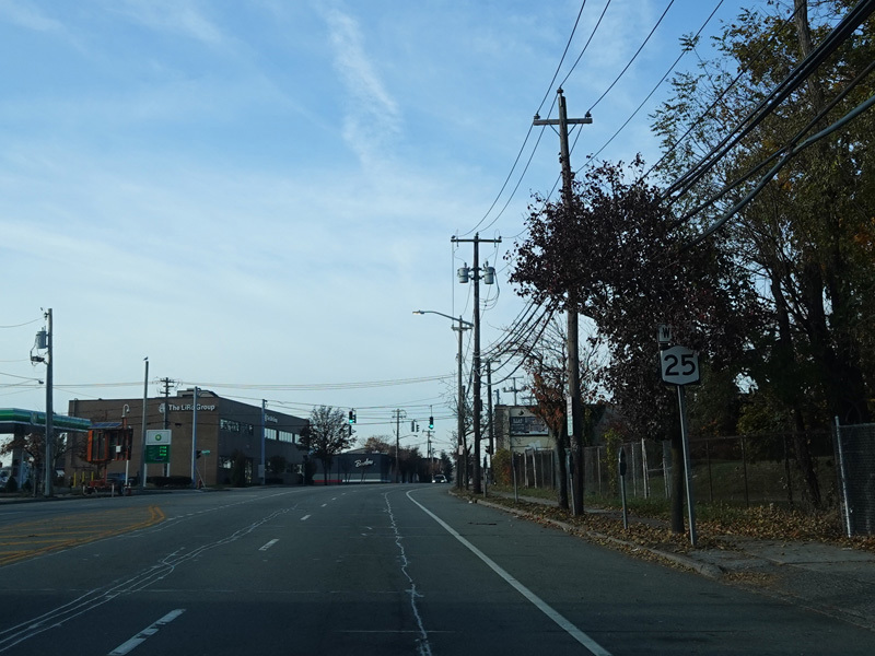 The roadway splits. Bear left to stay on Jericho Turnpike. Bear right for Hillside Avenue (NY 25B), which begins here.