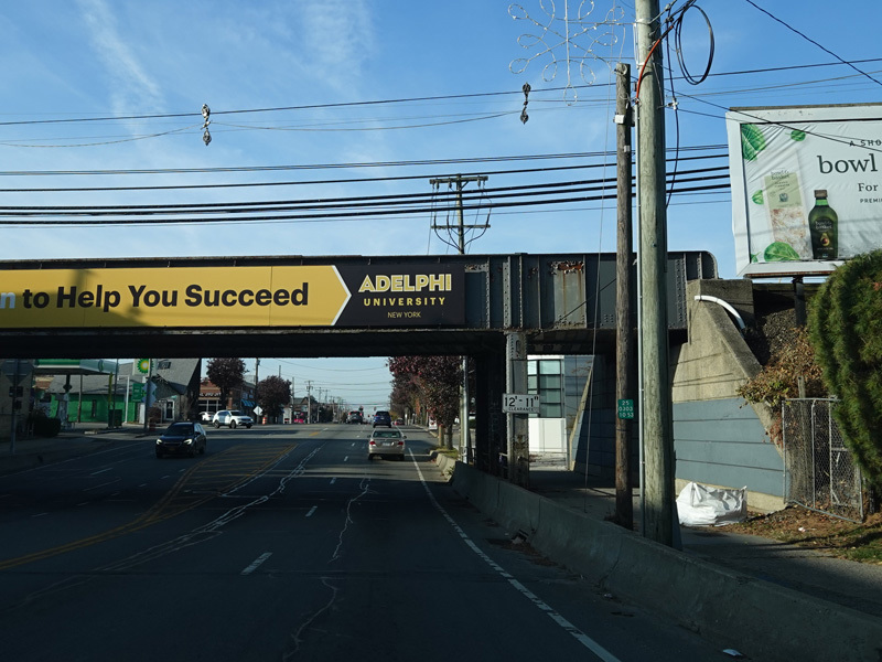 Jericho Turnpike continues west through Mineola. The Oyster Bay Branch of the Long Island Rail Road passes over Jericho Turnpike in this area. There are traffic lights at Willis Avenue and Mineola Boulevard.