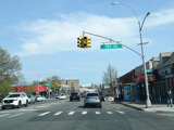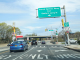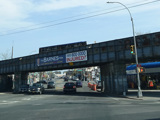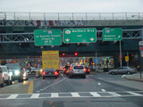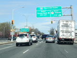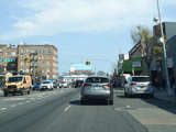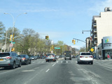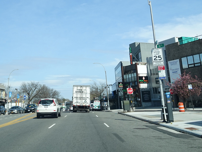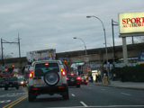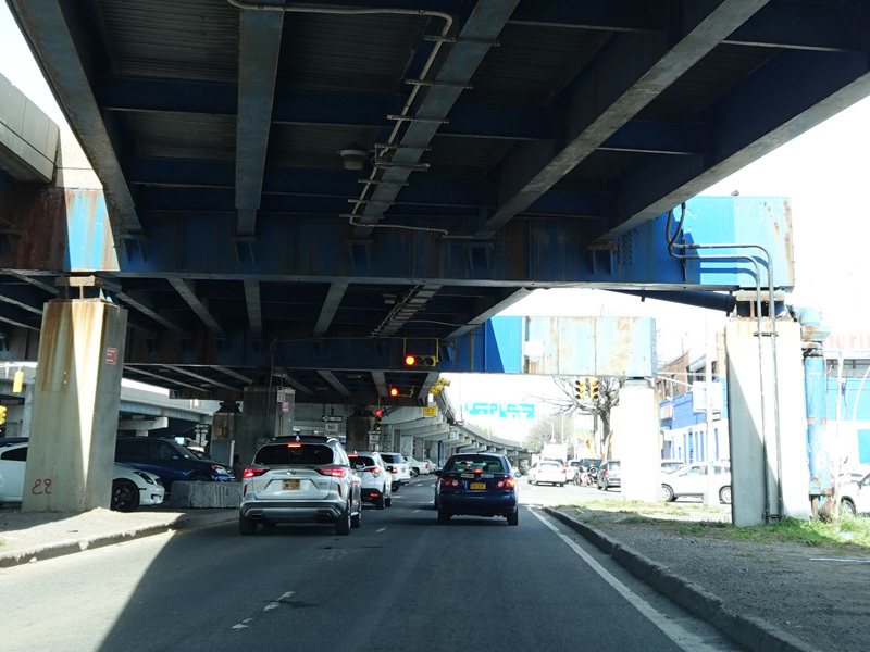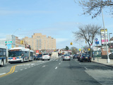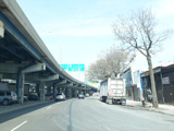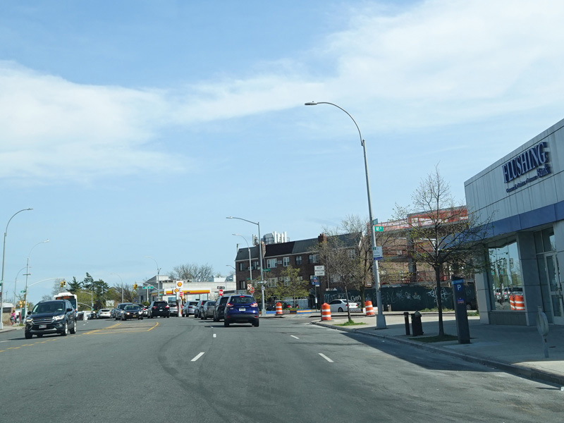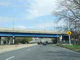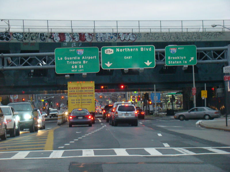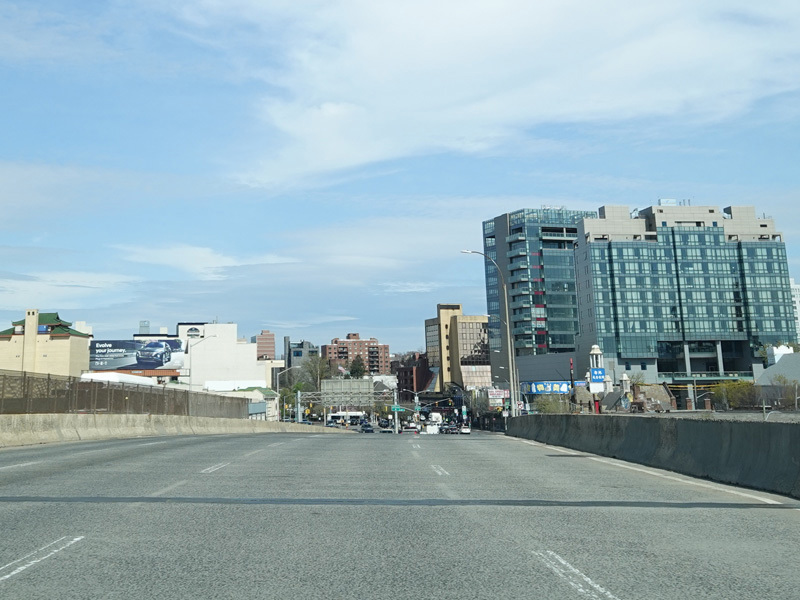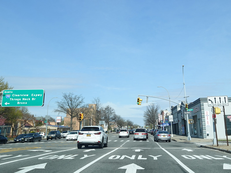 Northern Boulevard comes back down to the ground level. The elevated highway in the middle is the ramp between the Grand Central Parkway and the Van Wyck Expressway (I-678).