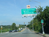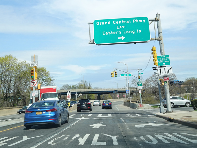 There is a traffic light with an oversized street-name sign at 114 Street. Turn right to access the Grand Central Parkway east.