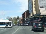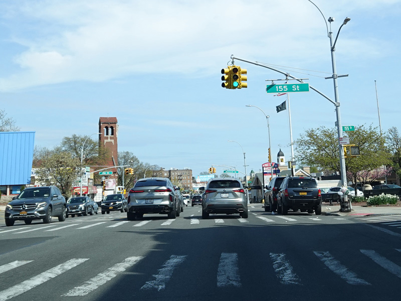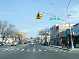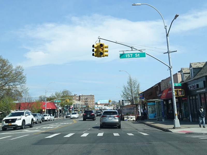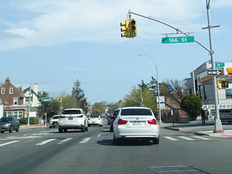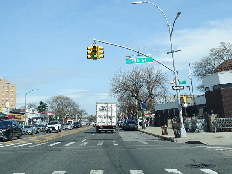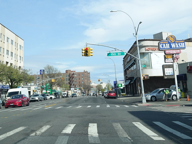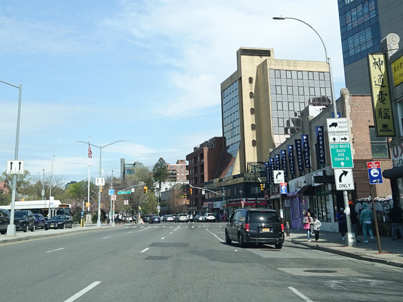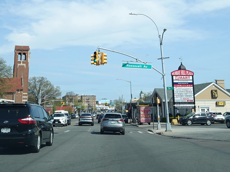 Northern Boulevard passes through Flushing and Auburndale. There are oversized street name signs at Prince Street, Main Street, Union Street, Bowne Street, Parsons Boulevard, Murray Street, Roosevelt Avenue, Utopia Parkway, and Francis Lewis Boulevard, as well as various numbered street that ascend to the east.