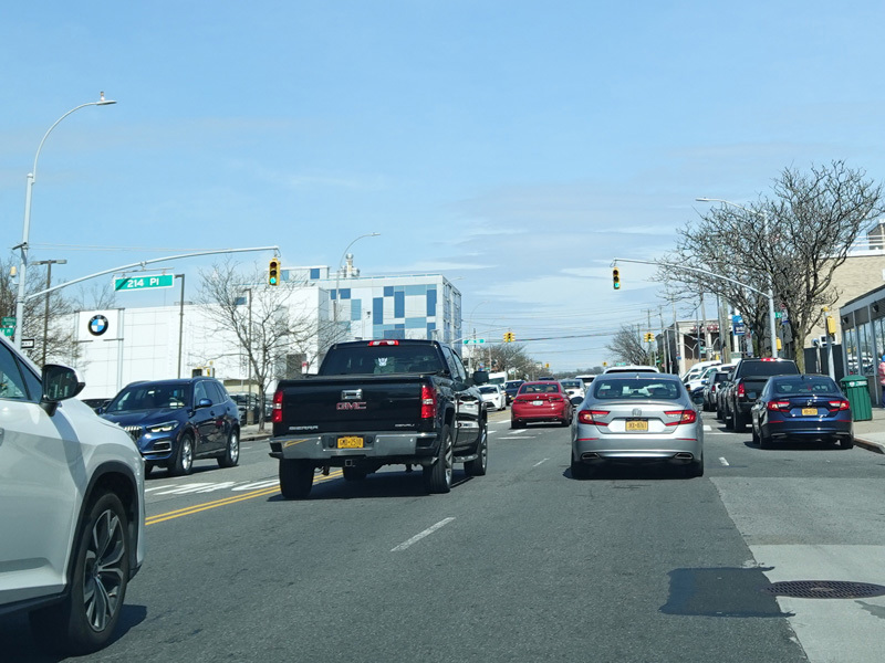 Northern Boulevard runs east through Bayside. There are oversized street name signs at Oceania Street, 211 Street, Bell Boulevard, 214 Place, 215 Street, 216 Street, and 221 Street.