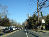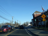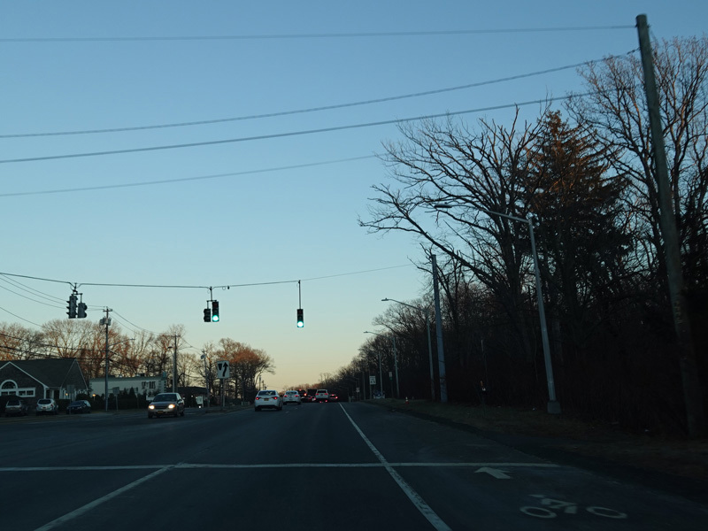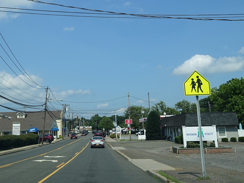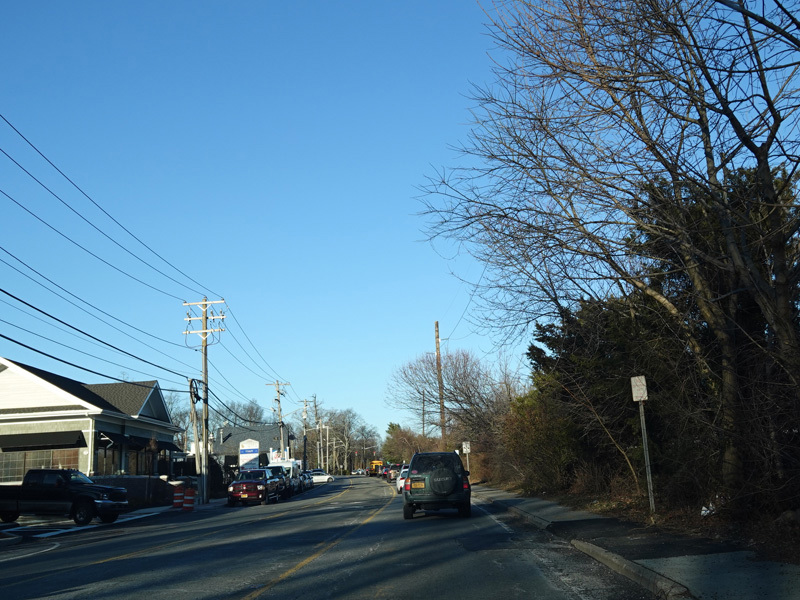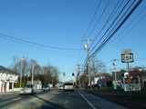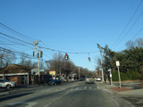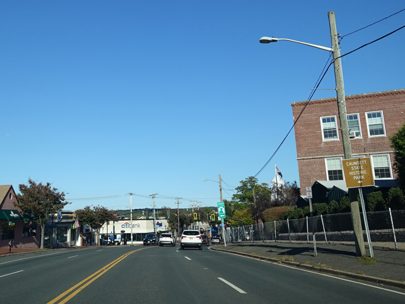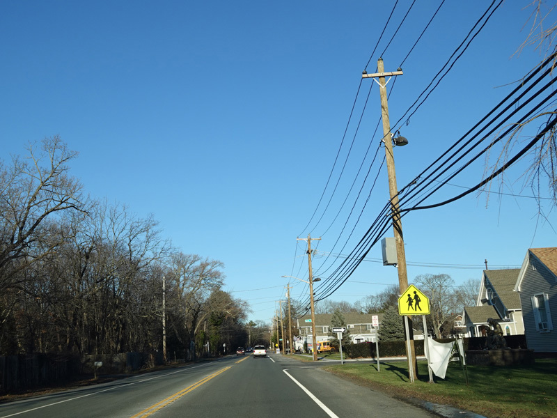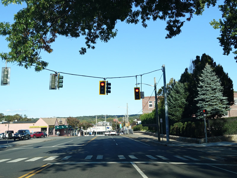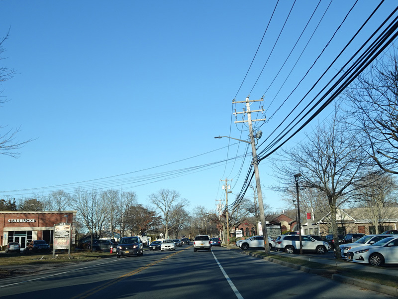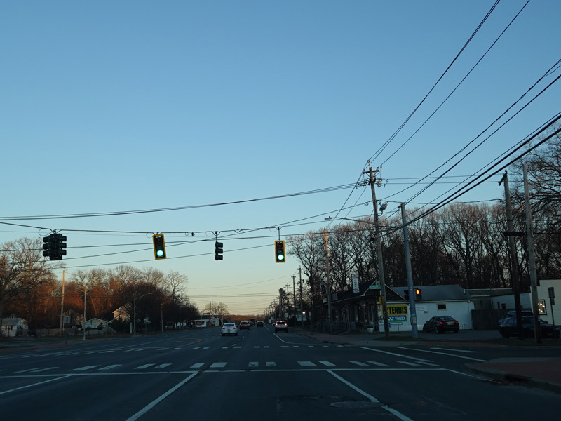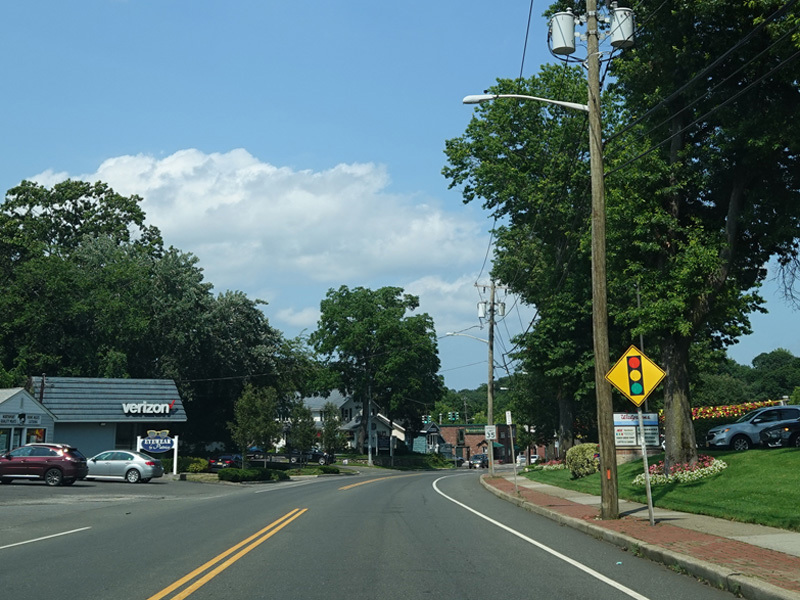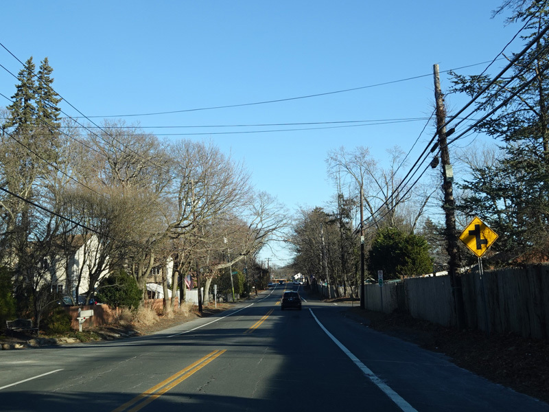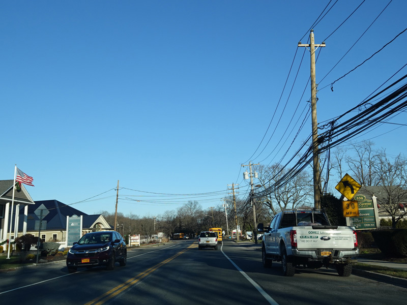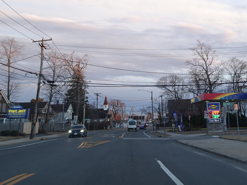 Skipping east to Port Jefferson, West Broadway ends at a flashing red traffic light with a stop sign. Turn right to stay on NY 25A.