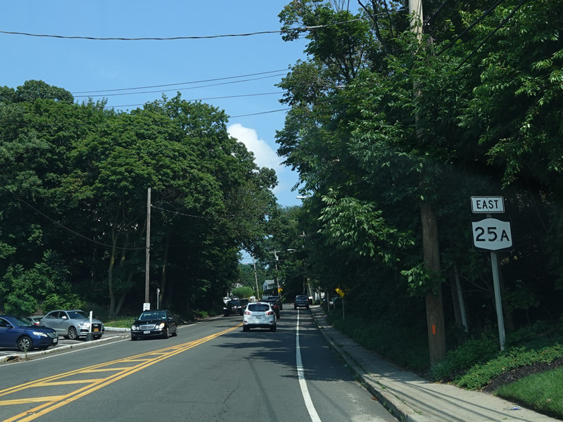 The median ends, and NY 25A continues east as a two-lane undivided road.