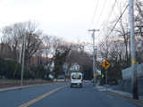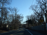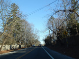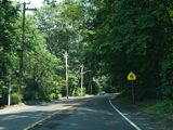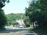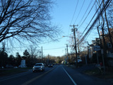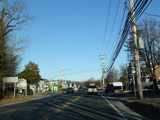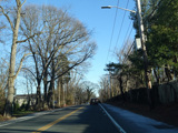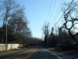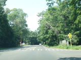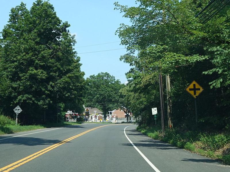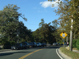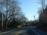 North Country Road continues through Stony Brook as a two-lane undivided road. The Port Jefferson Branch of the Long Island Rail Road and the Stony Brook train station are along the right here.