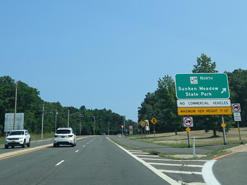 NY 25A widens to become a four-lane divided highway. There is a cloverleaf interchange with the Sunken Meadow Parkway.